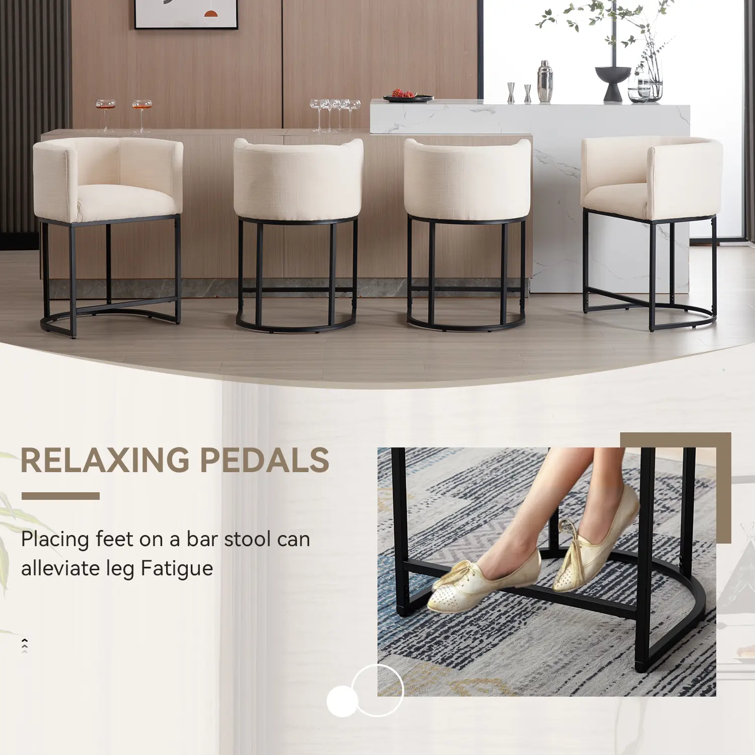 ćBarrel Shape DesignćThe counter stools feature the barrel tub design with smooth lines, just like a work of art. The soft, thickened, high-density foam cushion and bucket back perfectly wrap your body for a comfortable sitting experience and the footstool serves as an extra support to relax your legs.