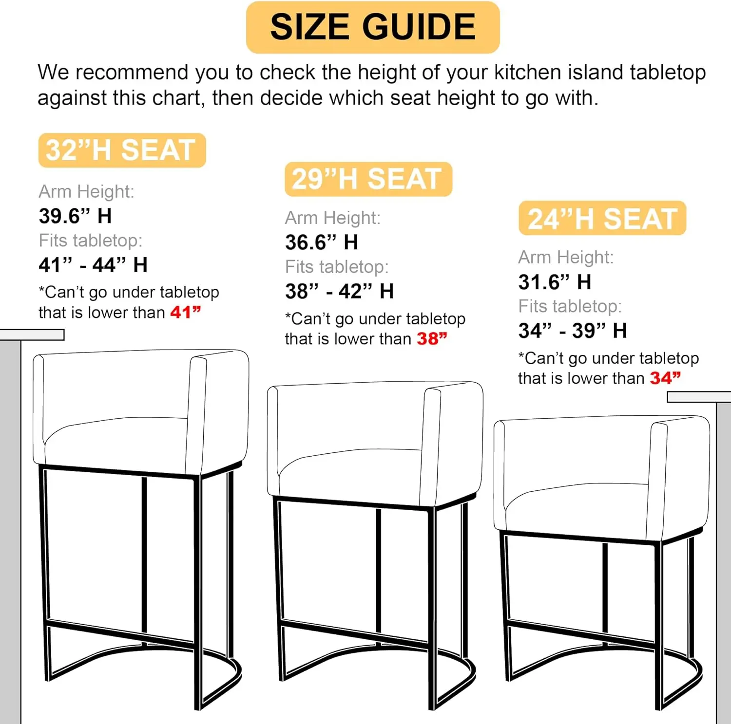 ćDimensionsćSeat Height 24", Arm Height 32.5", best fit for desk height between 33" - 38" H. Please confirm the height of the table and dimension picture before purchasing.Weight Capacity: 250 LBS.