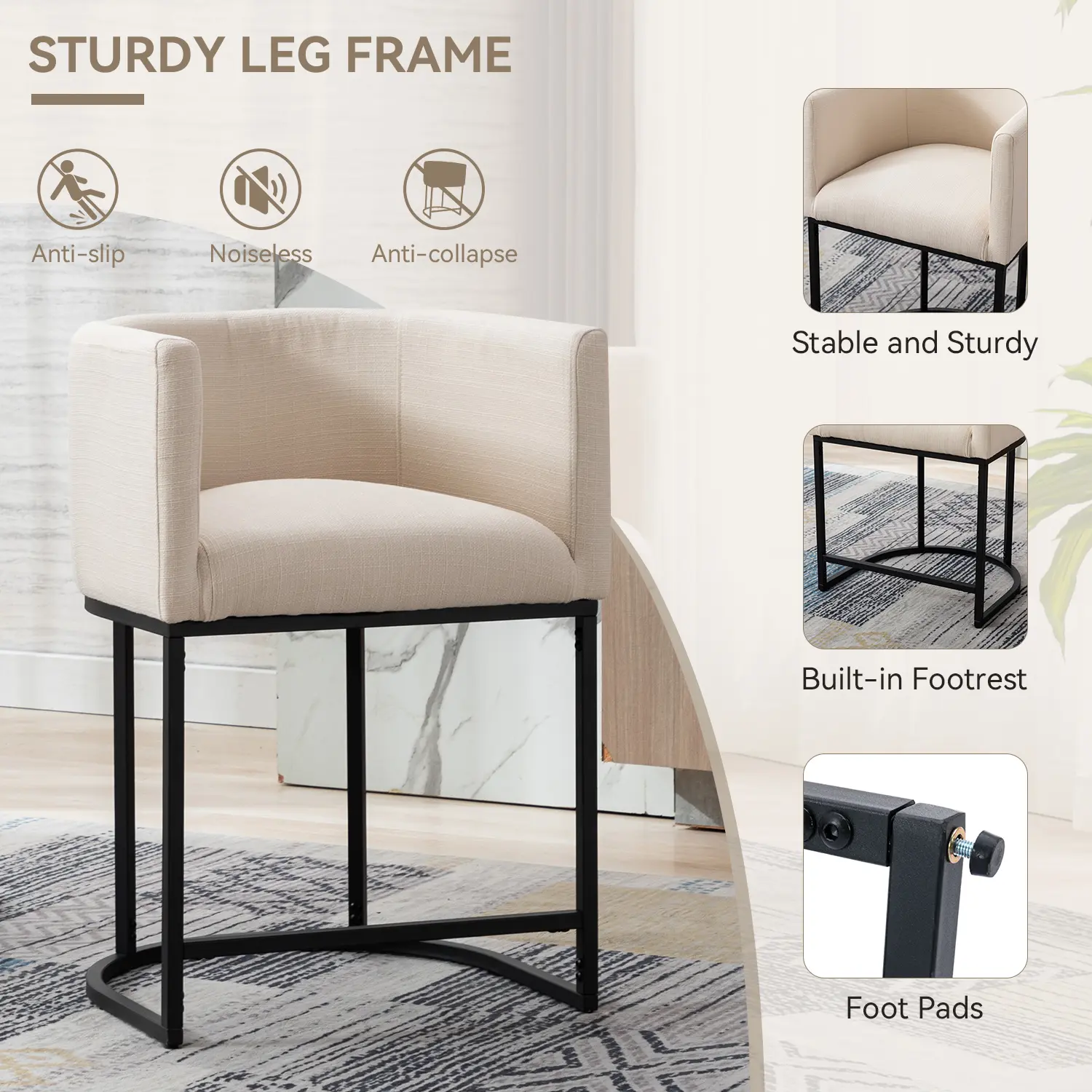 ćSturdy FramećCounter height bars tools are made of tubular metal frames, the benefit of ground support, more stability and sturdiness. The bar stool comes with pre-assembled pads to protect your floor from scratches.
