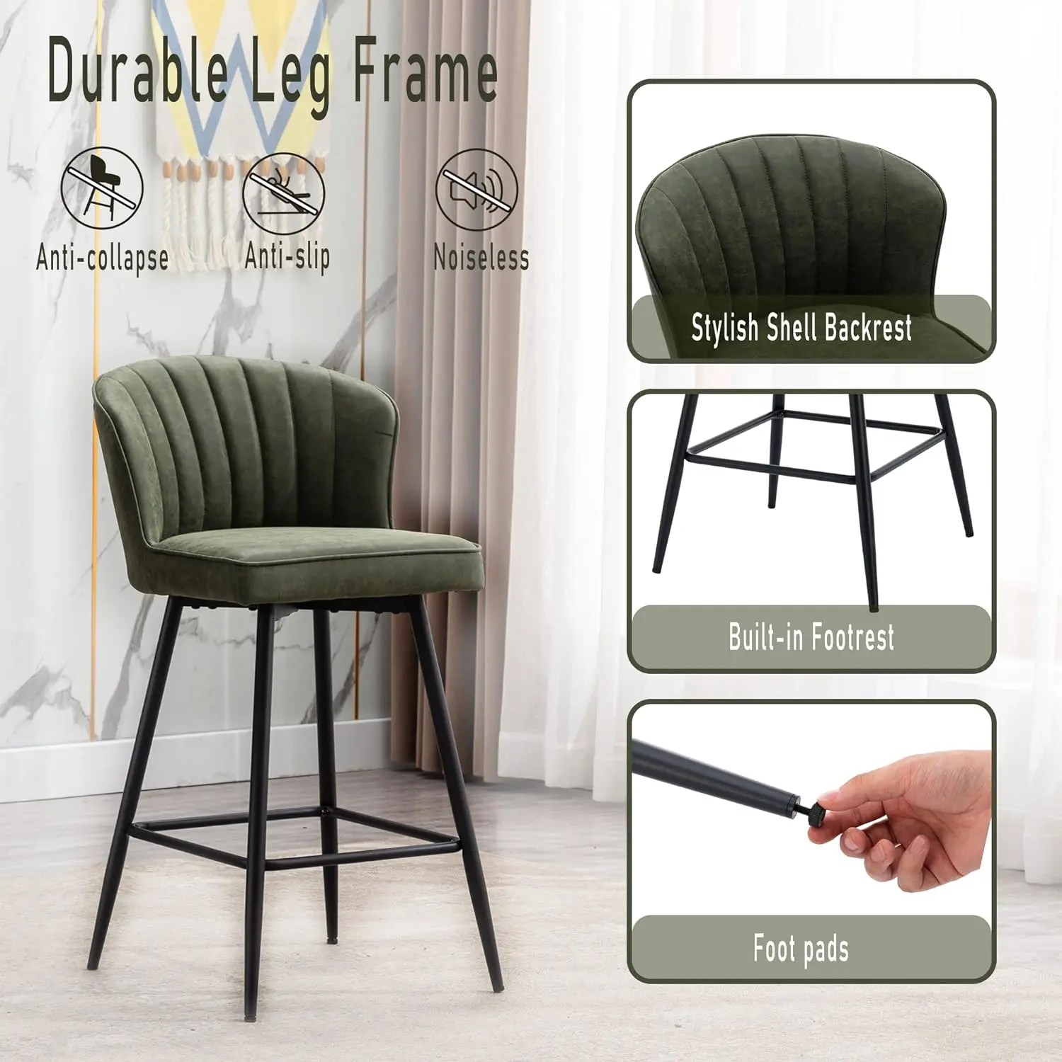 【Ergonomic Design】: These counter-height bar stools feature unique and sleek shell backrests designed with ergonomics in mind, providing extra back support while adding beauty. The 2.5-inch thick high-density sponge cushion adds extra comfort, while the footrest allows you to relax your legs.