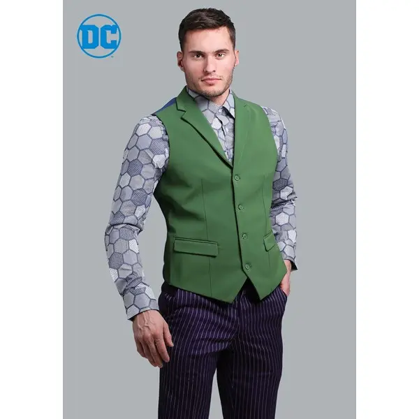 This lush, green vest is made of 100% polyester and brings a dash of playful color to any formal event. The vest has an adjustable back strap, allowing you to get a stylish fit. It’s designed to match The Joker suit pieces, so it pairs perfectly with the other pieces to create a cinematic fashion experience. It’s perfect for a stroll through Gotham City, or a high society fund raiser being held at the top of the Wayne Enterprises building.