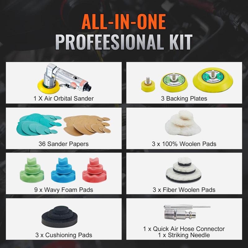 • Lower Vibration, More Stability: This random orbital air sander kit includes 3 cushioning pads (1/2/3 inches) that absorb vibrations and impacts, ensuring a smoother and more stable polishing process. Moreover, these pads can expand your polishing area and easily tackle workpieces of various shapes and curved surfaces.
