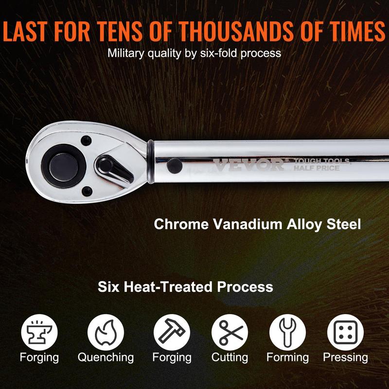 • Durable Construction: Constructed from robust chrome-vanadium steel, this heavy duty torque wrench undergoes a rigorous six-stage heat-treated process and chrome-plated surface coating for optimal resistance to rust and corrosion. Additionally, the torque wrench's smooth surface facilitates easy cleaning.