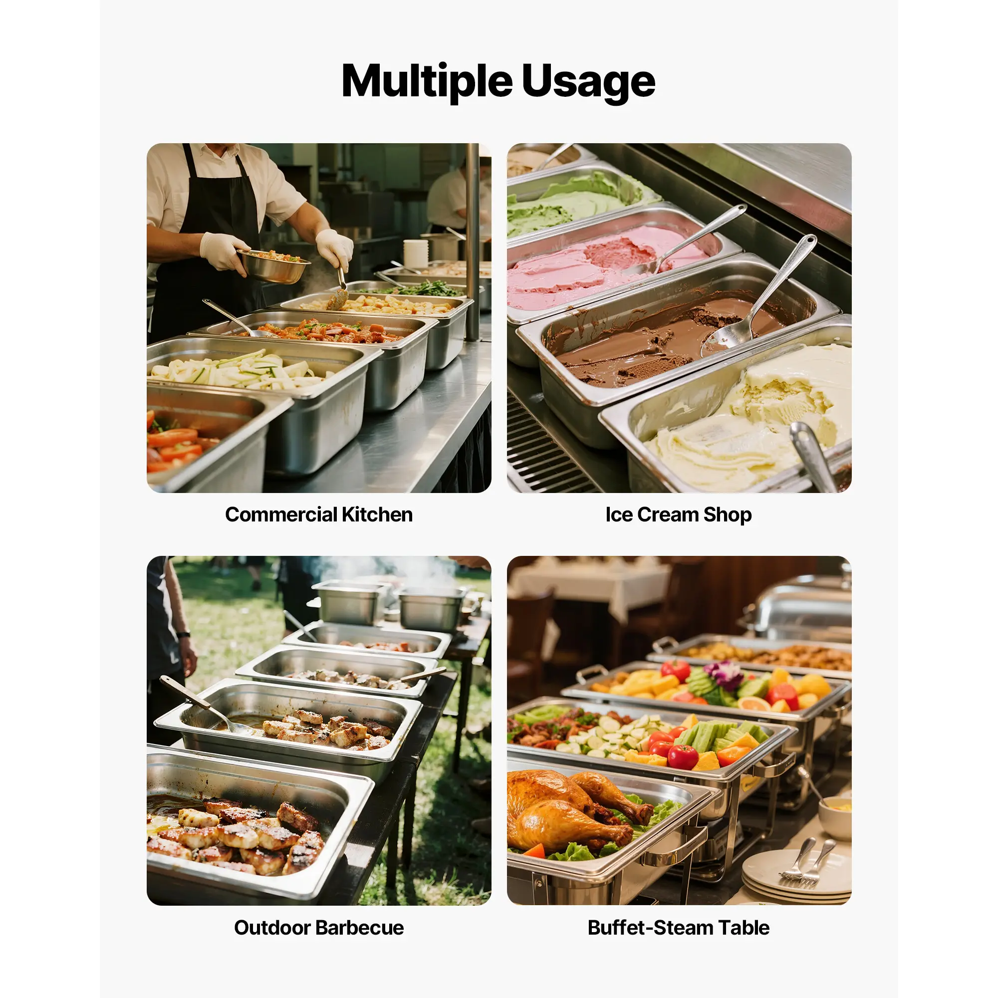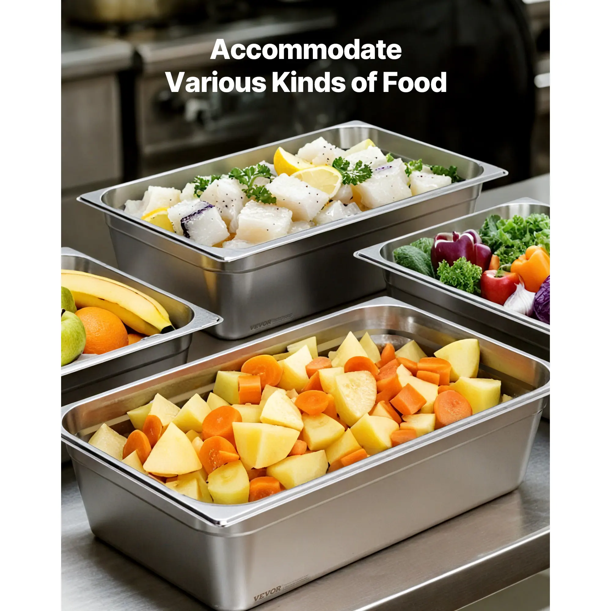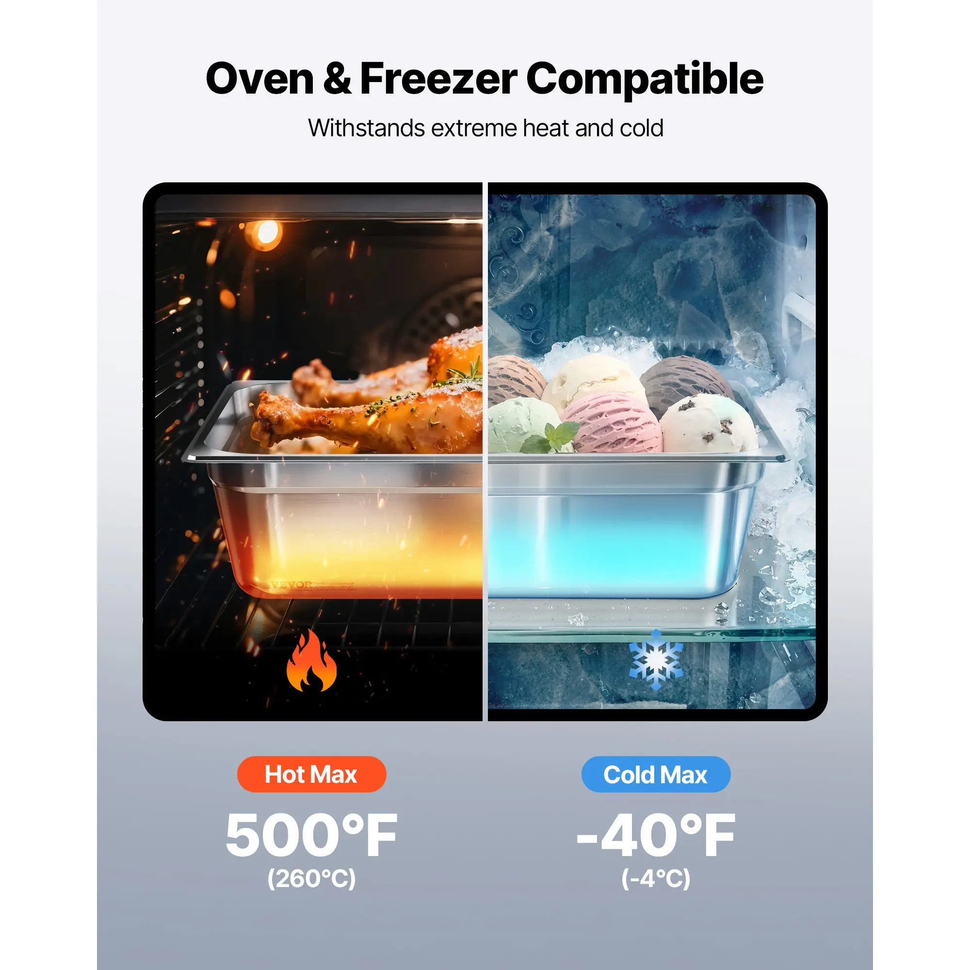 • Commercial-Grade Stainless Steel: Our Stainless Steel Hotel Pan is crafted from commercial-grade 22-gauge SS201 stainless steel for long-lasting durability and excellent rust resistance. It’s ideal for holding both hot and cold foods and withstands temperatures from -40℉ to 500℉ (-4℃ to 260℃). Suitable for high-temp commercial dishwashers, refrigerators, freezers, and more
