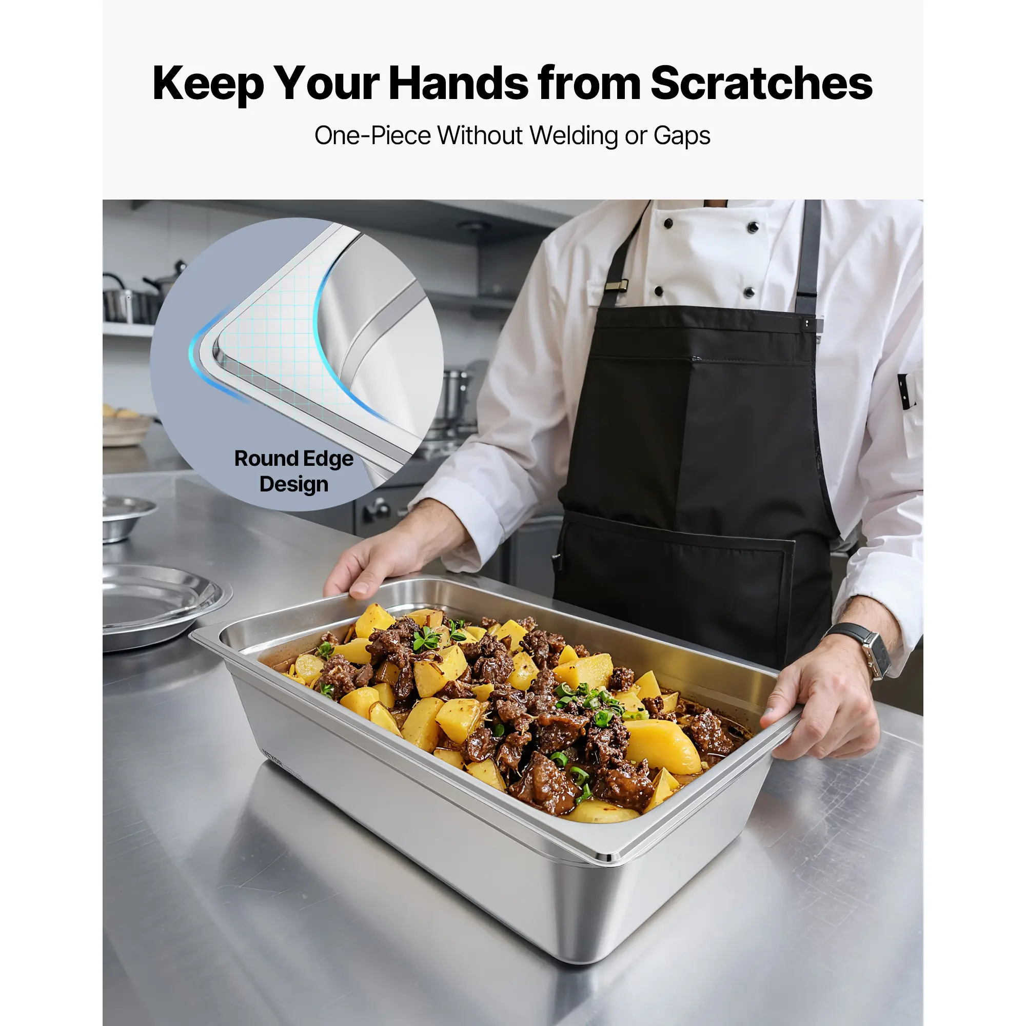 • Smooth Edges: This Stainless Steel Restaurant Pan features a seamless, one-piece construction with smooth edges that won't scratch your hands during use or cleaning. The matte electrolytic finish adds a modern, professional look—great for catering, buffet lines, and commercial kitchens