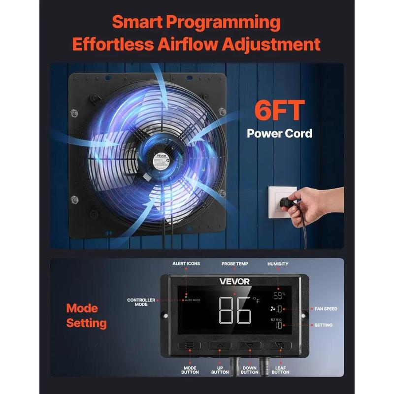 The fan features an intelligent controller with temperature and humidity triggers. It offers up to 10 speed settings that automatically adjust to changing conditions. Multiple modes, timer, and alarm provide full control for any situation.
