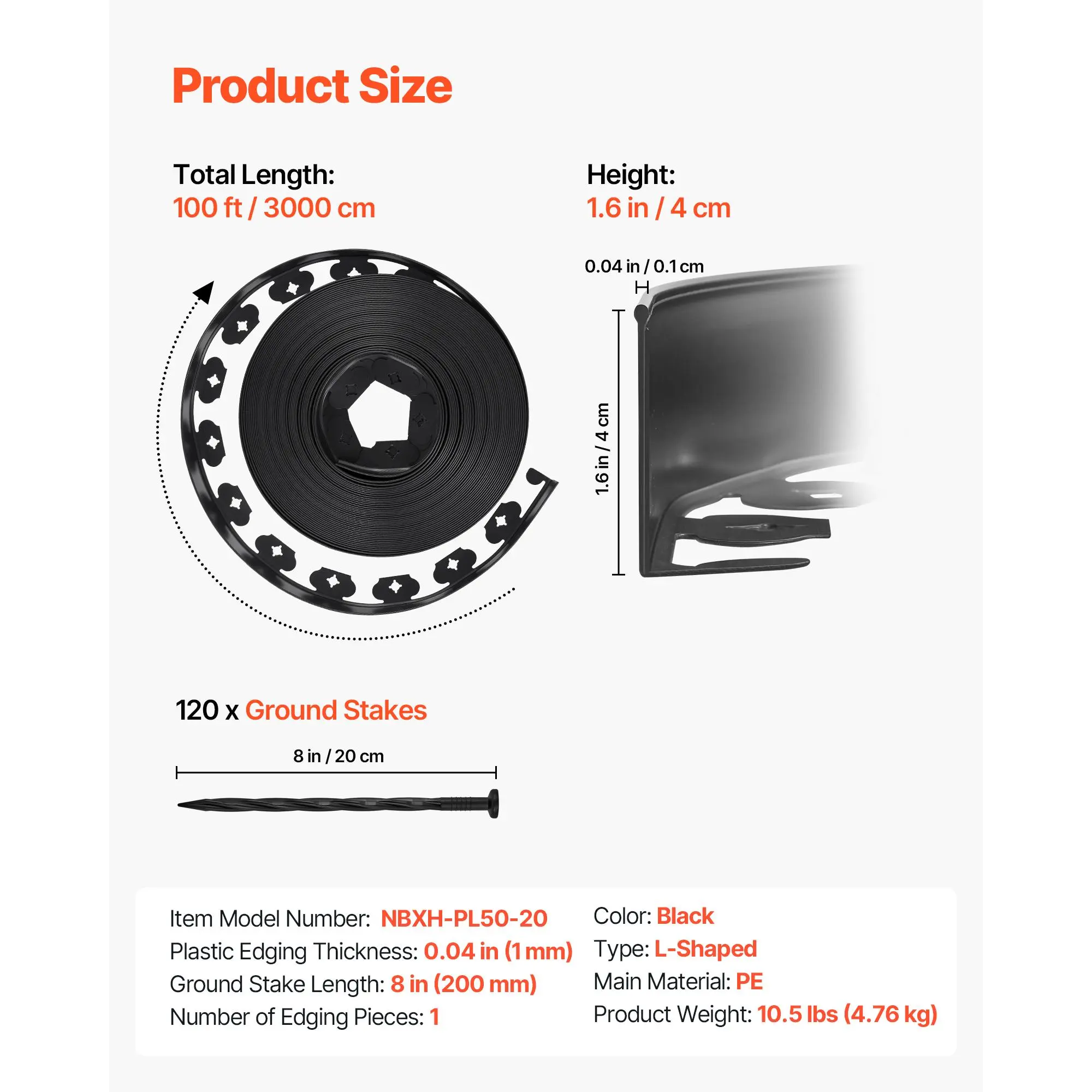 • 100 ft x 1.6 in Garden Edging: This 100 ft long plastic garden edging roll is ideal for long boundary installations, along walls, walkways, or large landscaping areas. The 1.6 in medium height works well for separating flower beds, gravel paths, or lawn edges in home gardens.