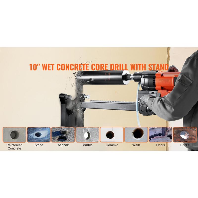 • 10-inch Wet Drilling: Our standup core drilling machine with stand can perform wet drilling, and you can feel assured of accuracy when boring holes in a variety of surfaces with a 10 in / 26 cm diameter hole capacity. Note: The drilling bit is not included.