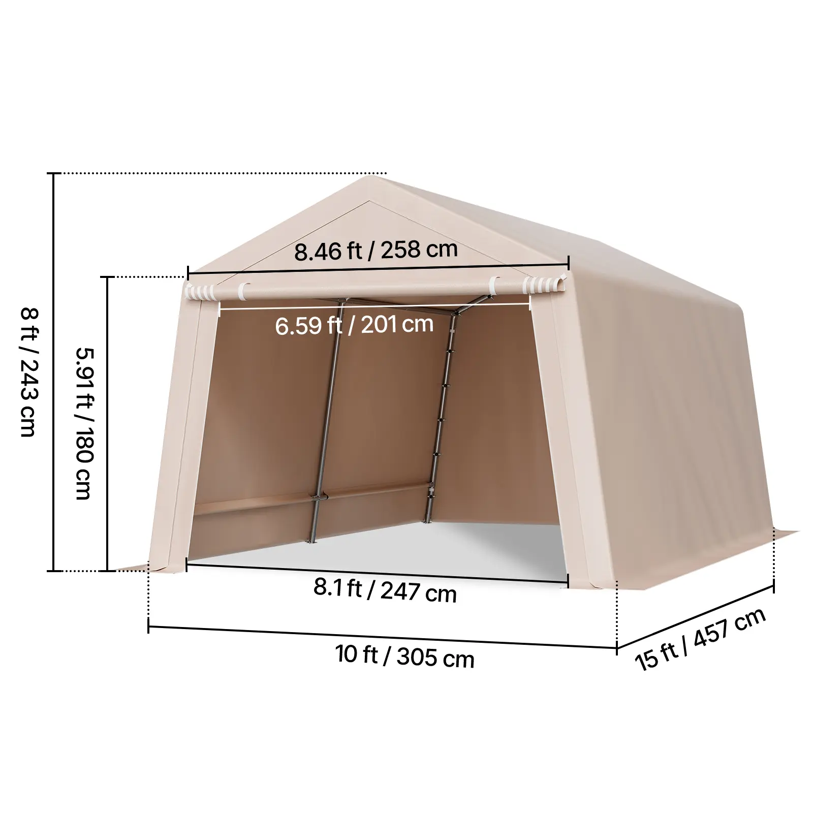 • Heavy-Duty Metal Frame: This large 10x15 ft portable storage shed is built with galvanized steel pipes, with a pipe diameter of 38mm and wall thickness up to 0.7mm. This makes it resistant to cracking, peeling, rusting, and corrosion, ensuring stability and security even in harsh weather conditions.