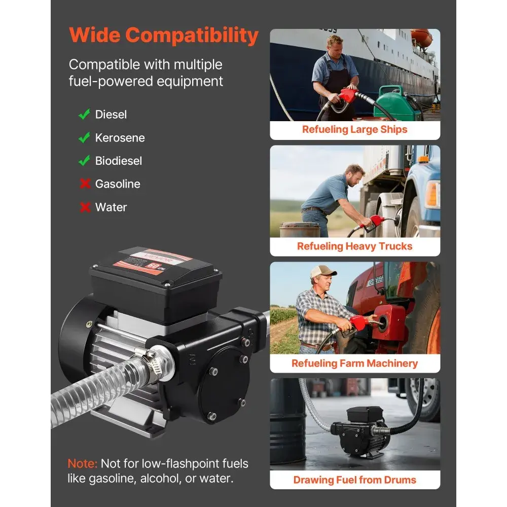 Designed for diesel, kerosene, and biodiesel. Supports various diesel-powered equipment like trucks, excavators, tractors, farm machinery, and generators. Not for use with gasoline.