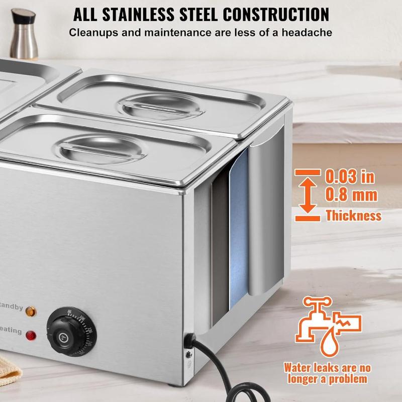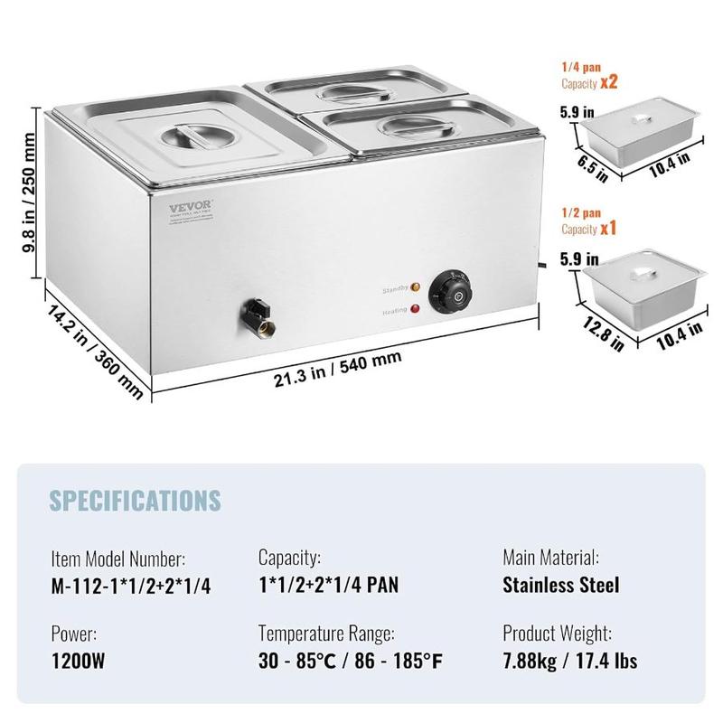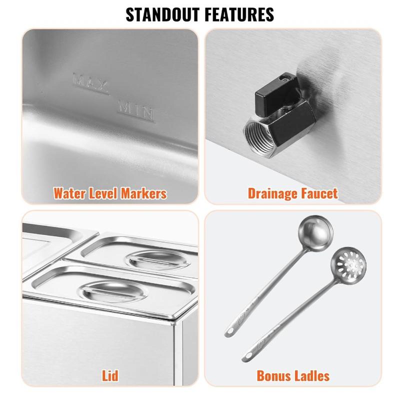 VEVOR 110V Commercial Food Warmer, 3 - Pan Stainless Steel Bain Marie 21 Qt Capacity, 1200W Steam Table Electric Soup Warmer w/Lids 2 LadlesVEVOR 110V Commercial Food Warmer, 3 - Pan Stainless Steel Bain Marie 21 Qt Capacity, 1200W Steam Table Electric Soup Warmer w/Lids 2 Ladles