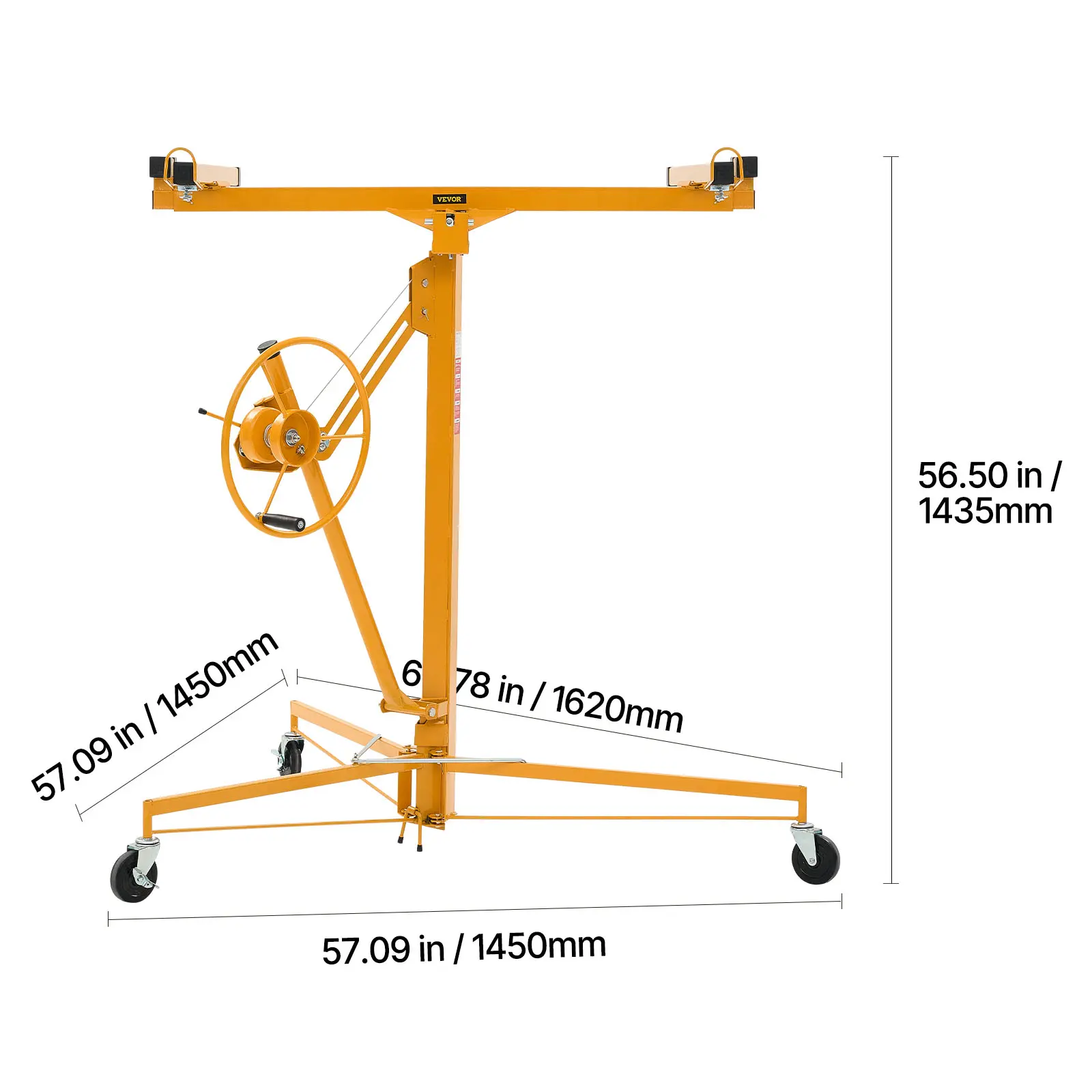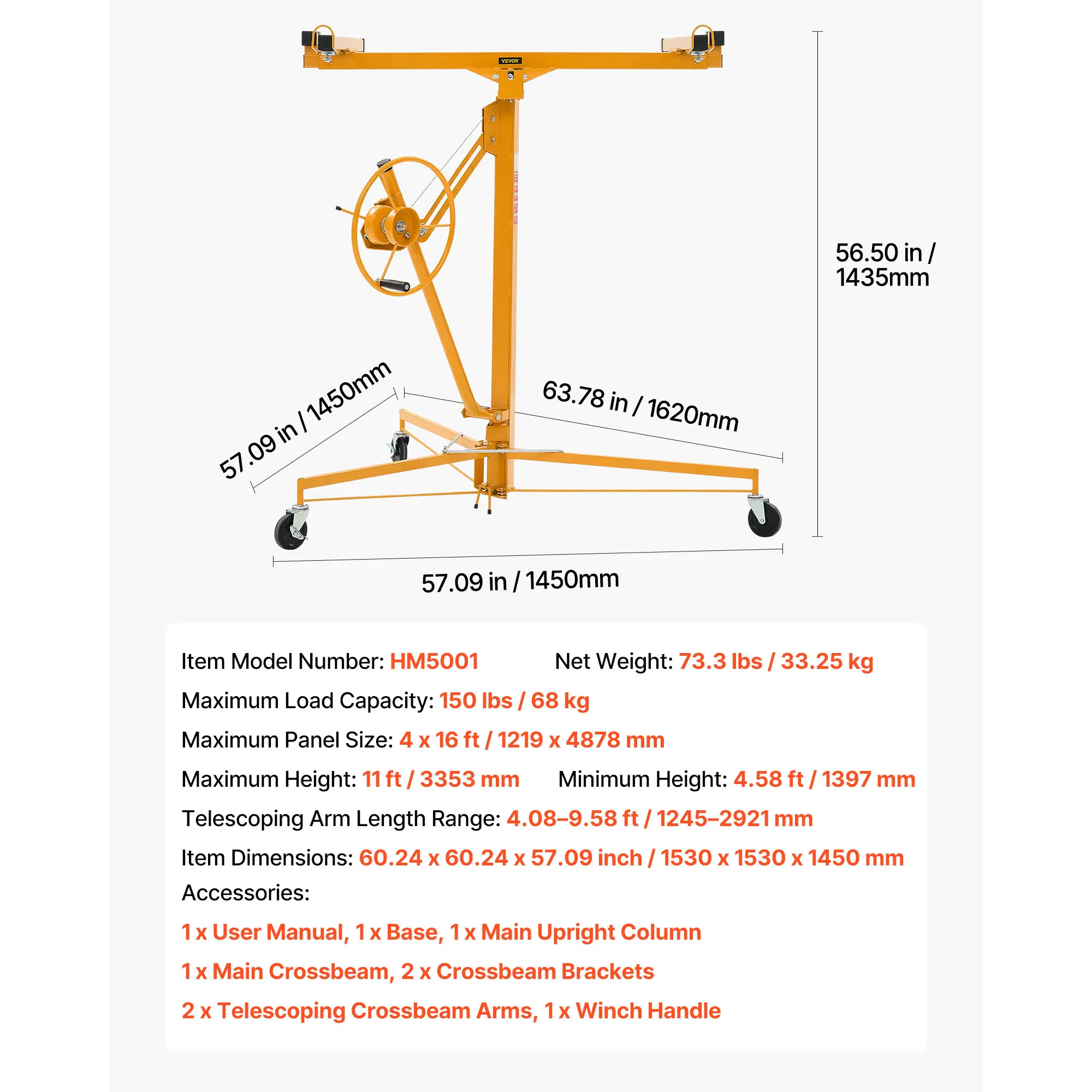 • Adjustable Height and Length: Telescoping Arm Length Range: 4.09–9.58 feet / 1245–2921 mm, making it ideal for panel installations. The sheetrock lift can reach a height of 11 feet / 3353 mm, helping you secure sheetrock to the ceiling