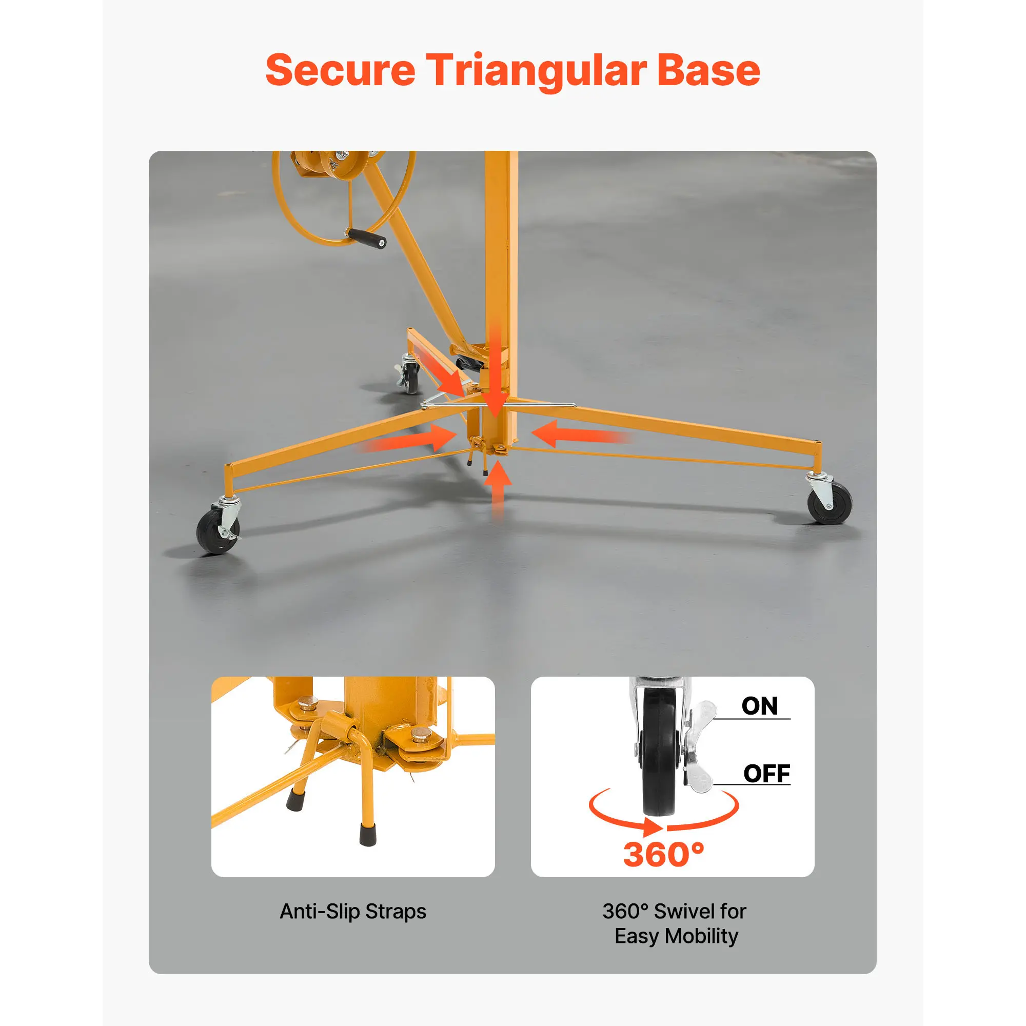 • Secure and Stable: The drywall panel lift is supported by a wide tripod base with 3 non-slip lockable wheels, ensuring stability and security during use. The lockable legs provide extra support, making the setup secure yet easy to move