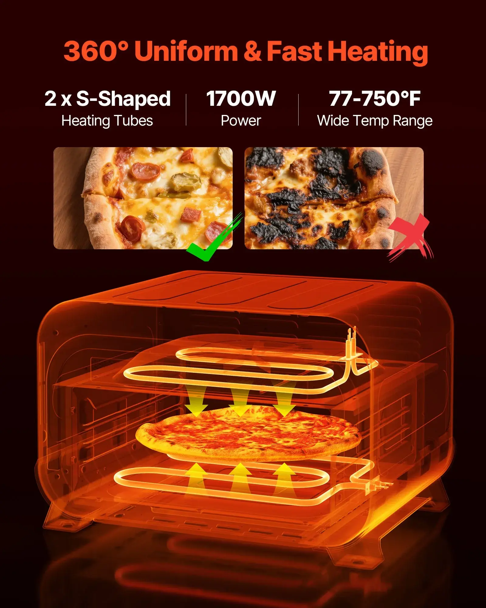 ·2-Minute Artisan Pizza: Our pizza oven heats up to 750℉ with 1700W high power and dual heating element—no flipping needed. Enjoy restaurant-style crispy crust and balanced texture in just 2 minutes.
