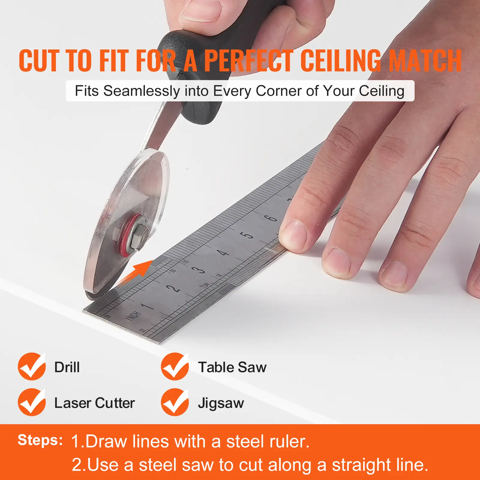 • Customizable Cutting: Easily cut tiles with a table saw, jigsaw, drill, or laser cutter to fit any corner of your ceiling. Achieve a perfect fit for every corner and edge, ensuring a seamless look throughout your room.