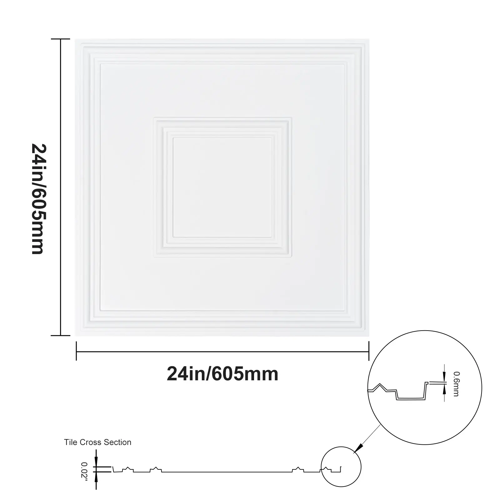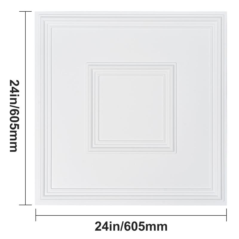 • 24” Ceiling Tiles: These square ceiling tiles measure 24”x24” with a geometric pattern, totaling 12 pieces to cover 48 square feet. Refresh your space with a clean, modern look.