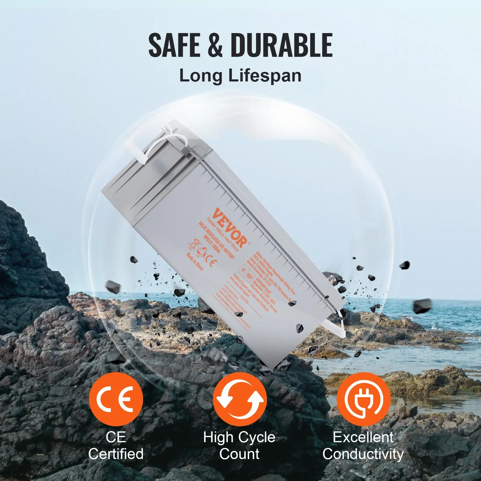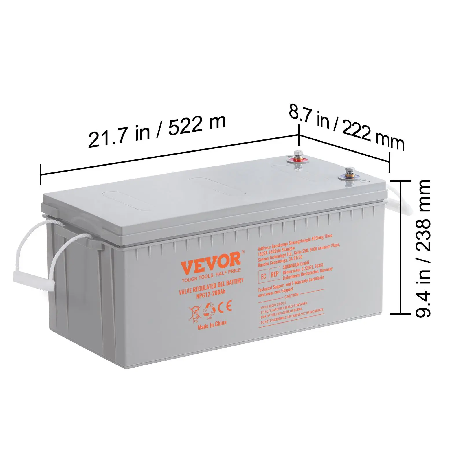 • Heavy-Duty Rechargeable Battery: The VEVOR 12V 200Ah rechargeable deep cycle battery, with dimensions of 21.7'' x 9.4'' x 8.7'', stores a substantial amount of energy, extending the runtime of most light-duty electric devices. Note: Professional charging equipment is required during use to ensure battery security.