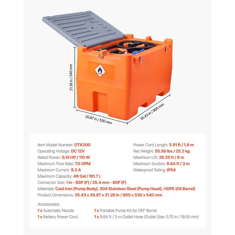 VEVOR 12V DEF Transfer Pump Kit, 8.5 GPM, Diaphragm Irrigation Self Priming Electric Water Pump, with 58 Gallon Tank, Automatic Nozzle, 13.12 ft Hose, 26.25 ft Lift, for Diesel Exhaust Fluid UreaVEVOR 12V DEF Transfer Pump Kit, 7 GPM, Diaphragm Irrigation Self Priming Electric Water Pump, with 48 Gallon Tank, Automatic Nozzle, 9.84 ft Hose, 26.25 ft Lift, for Diesel Exhaust Fluid Urea Liquid Portable Pump Kit High Durability Powerful Performance Portable Design Wide