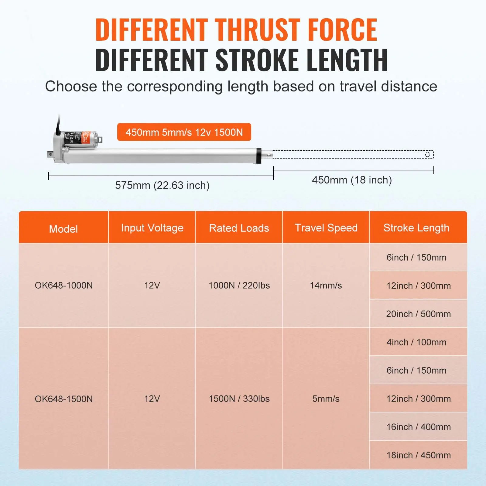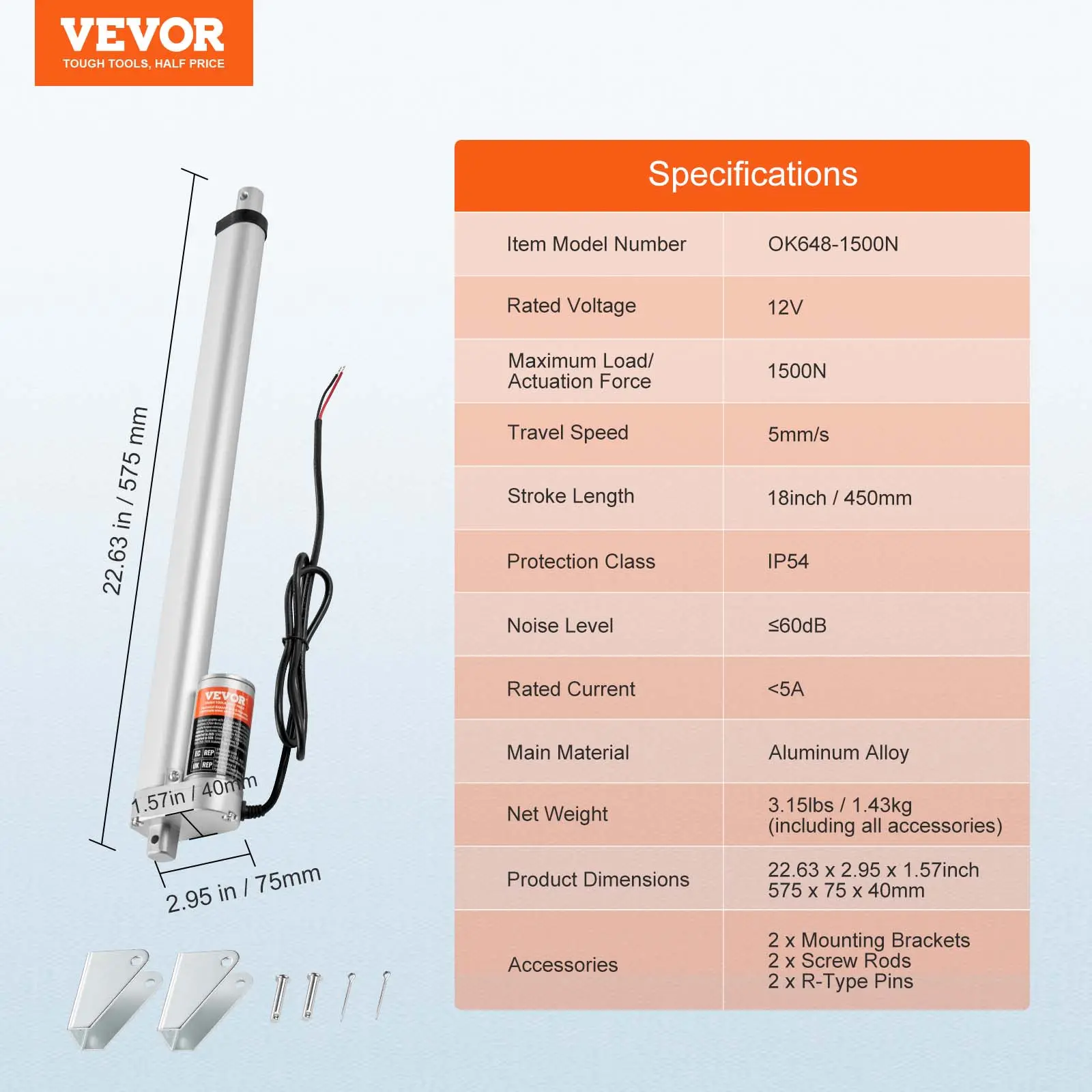 5. VEVOR Linear Actuator 12V, 18 Inch High Load 330lbs/1500N Linear Actuator, 0.19"/s Linear Motion Actuator with Mounting Bracket and IP54 Protection