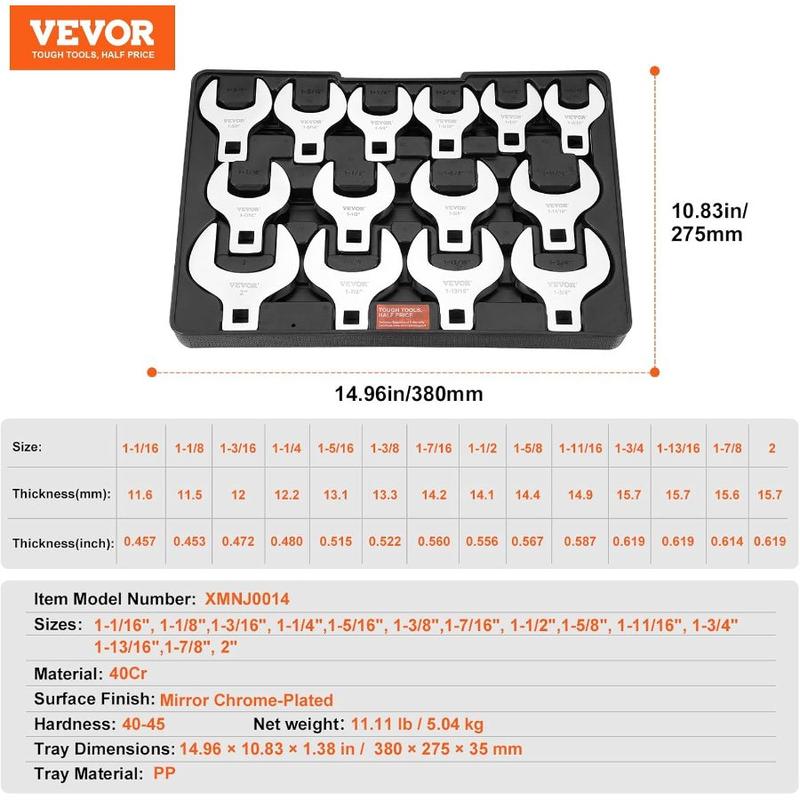 VEVOR Crowfoot Wrench Set, 1/2 Drive 14 - Piece SAE (1 - 1/16 - 2) Crows Foot Wrench Set with Storage Tray, 40CR Material with Laser Etched Sizing, for Mechanical Maintenance or RepairsVEVOR Crowfoot Wrench Set, 1/2 Drive 14 - Piece SAE (1 - 1/16 - 2) Crows Foot Wrench Set with Storage Tray, 40CR Material with Laser Etched Sizing, for Mechanical Maintenance or Repairs