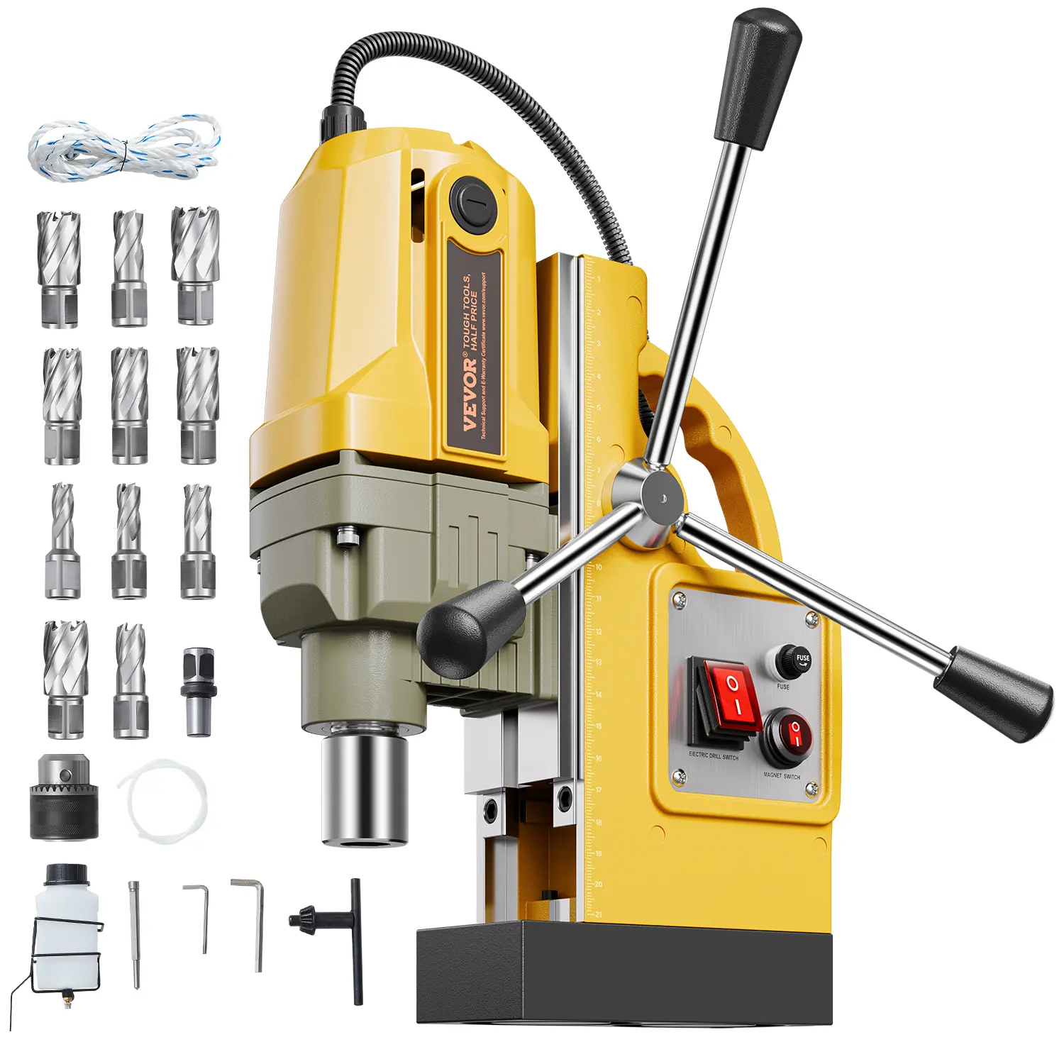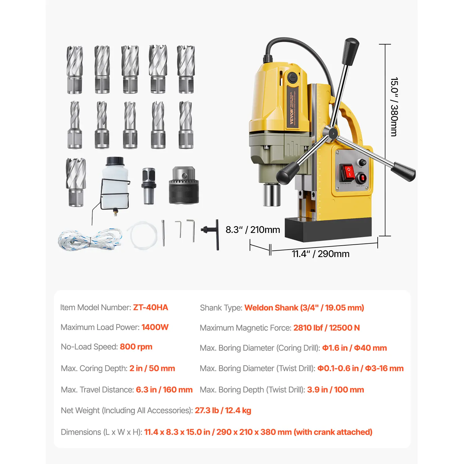 • Understand the Power: 2810 lbf / 12500N of robust force is created by the electromagnetic thickened base, featuring pure iron anchors the mag drill press solidly works at any angle stably during the drilling process. It comes with 11 pcs coring bits for your different drilling needs