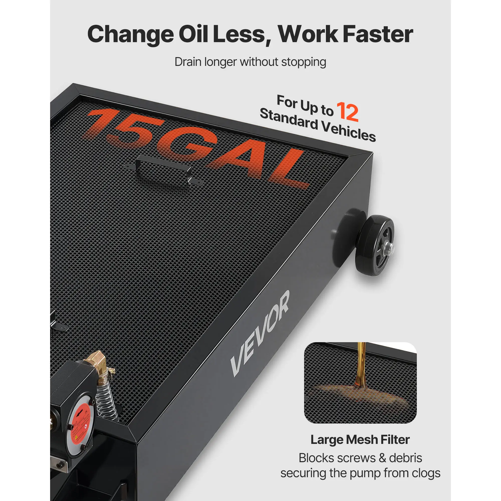• Large 15-Gallon Capacity: The 15-gallon oil drain pan stores oil from multiple vehicles at once. A 2.2 m hose provides smooth, steady draining, making it ideal for shops, farms, and long work sessions