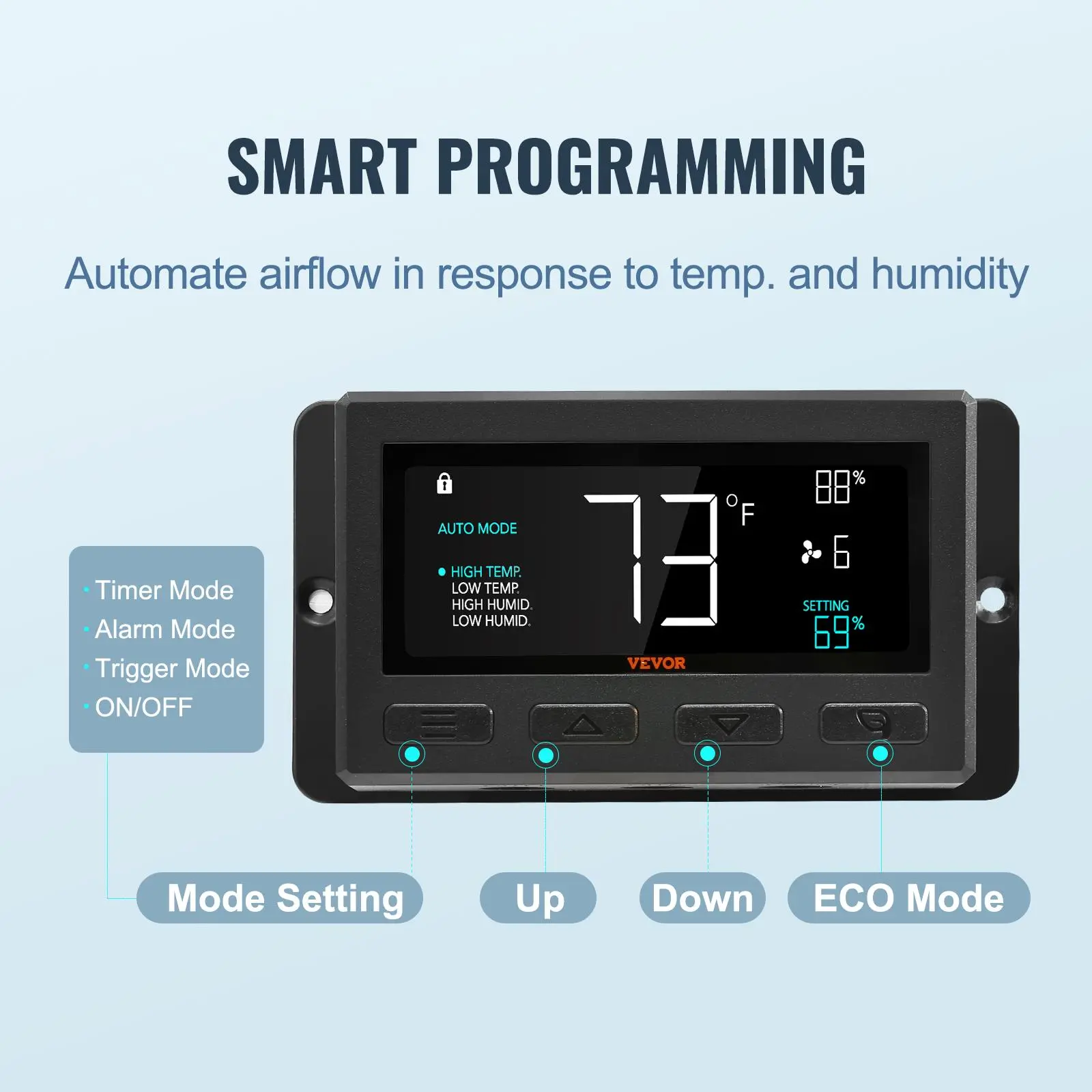 ·Smart Programming: We are equipped with an intelligent controller! Not only do you have temperature and humidity triggers, but it also allows you to set up to 10 speeds that will respond to changes in them. You won't miss a thing and will always be ready to adapt! There are multiple modes, allowing you to adjust as you wish. Timer and alarm modes are available on demand.