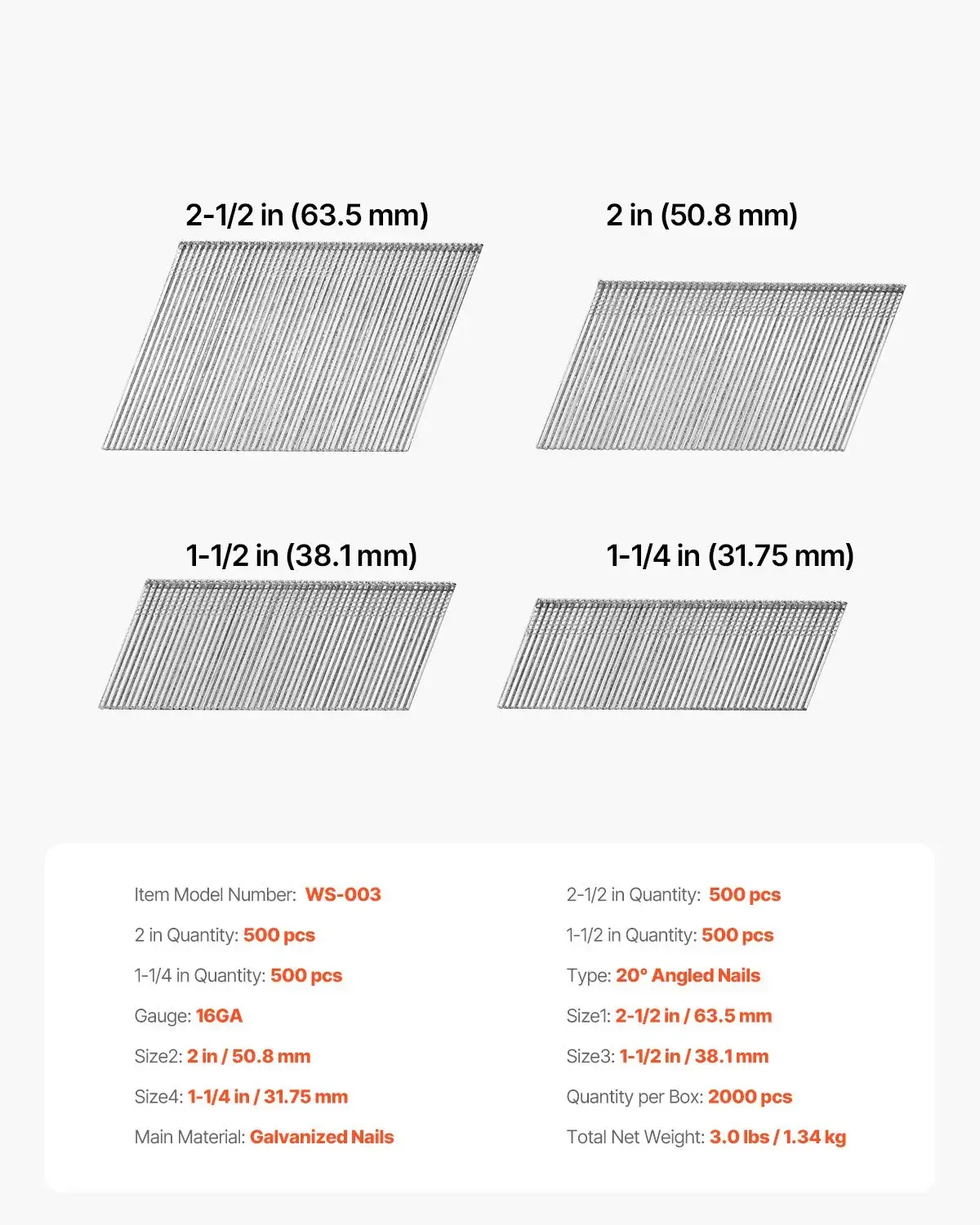 ·2000-Piece Set: This set contains 2000 pieces and 4 different sizes, including 2-1/2 in, 2 in, 1-1/2 in, and 1-1/4 in 20° angled finish nails, with short and long options. It is ideal for you to select different-sized nails according to your needs.