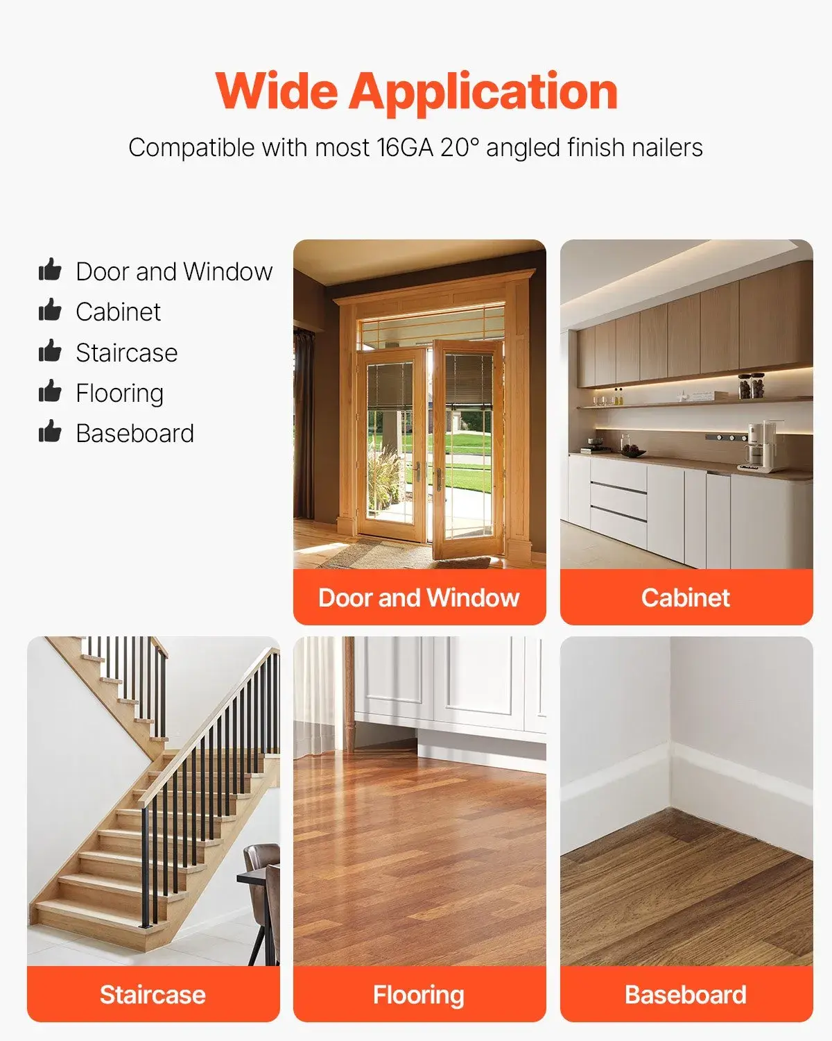 ·Universally compatible: These standard 16GA finish nails are compatible with most 16 gauge 20° angled finish nail guns, making them a convenient choice for professionals and DIY enthusiasts. Note: Do not use straight-finish nail guns.