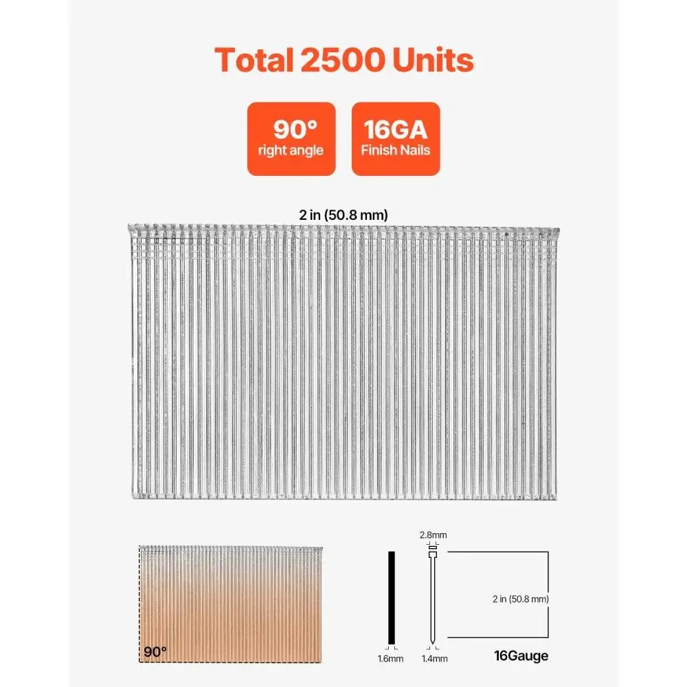 VEVOR 16 Gauge Finish Nails, 2 in Straight Finishing Nails, 2500-Count Galvanized Finishing Nail, Heavy-Duty 16 GA Brad Nail with Galvanized Anti-Rust Process, for Most 16GA Straight Finish Nailers