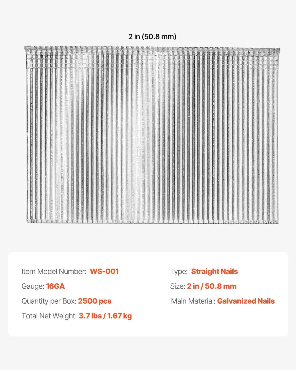 5. VEVOR 16 Gauge Finish Nails, 2 in Straight Finishing Nails, 2500-Count Galvanized Finishing Nail, Heavy-Duty 16 GA Brad Nail with Galvanized Anti-Rust Process, for Most 16GA Straight Finish Nailers