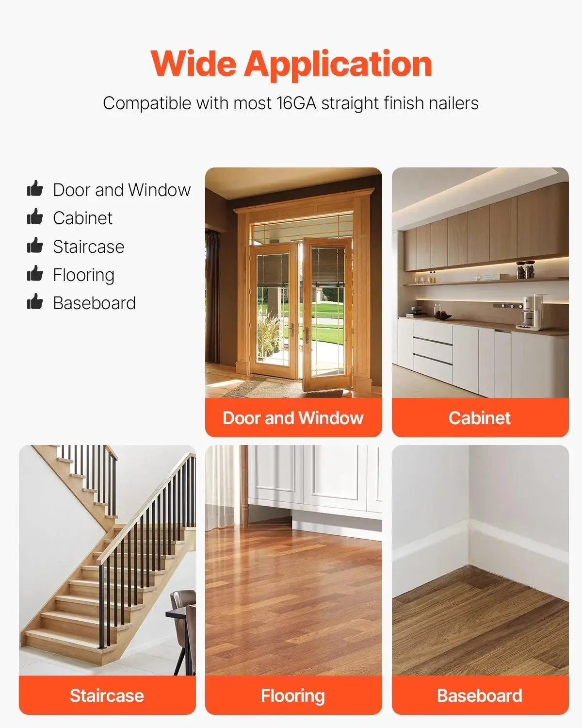 ·Universally compatible: These standard 16GA finish nails are compatible with most 16 gauge straight finish nail guns, making them a convenient choice for professionals and DIY enthusiasts. Note: Do not use angled finish nail guns.