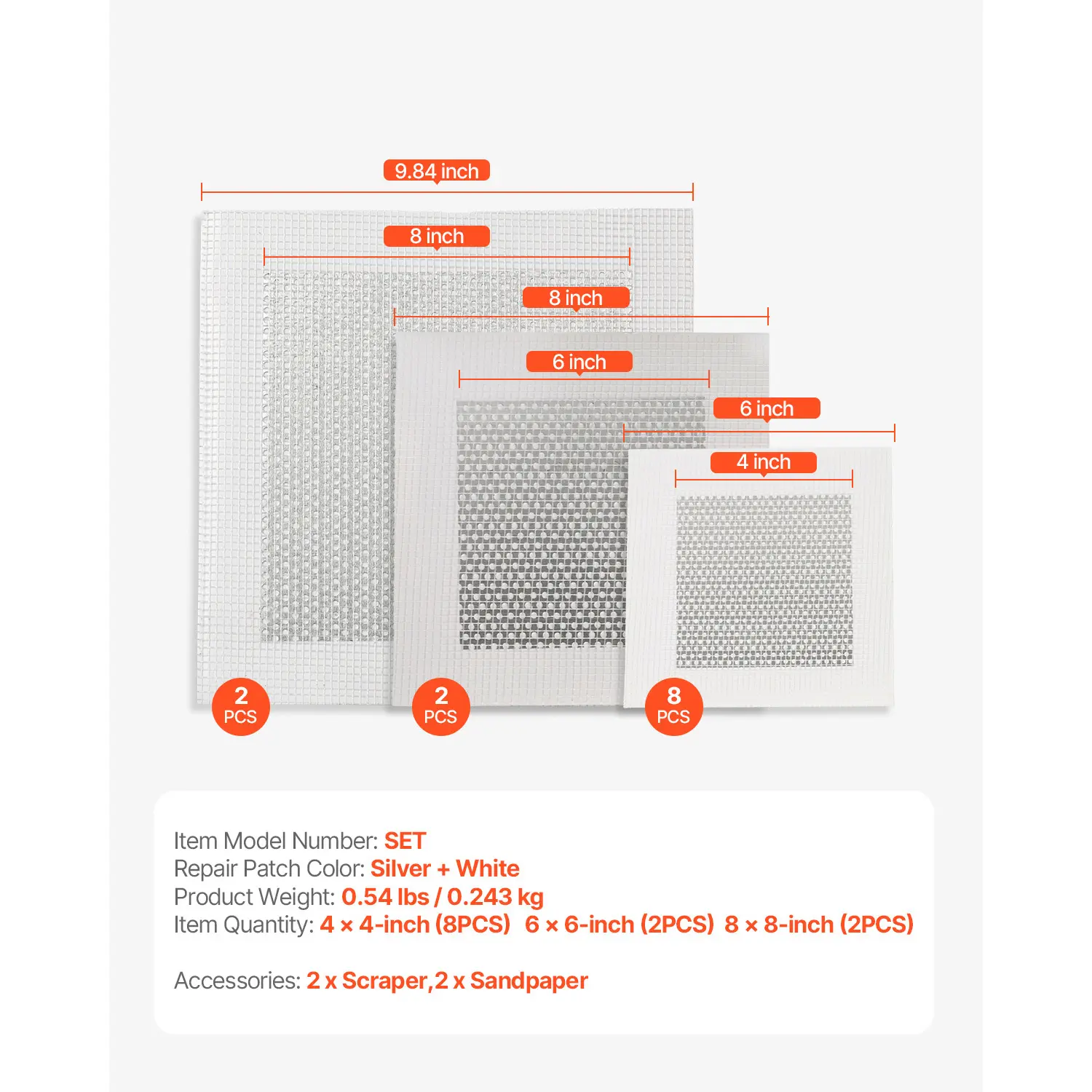 ·This kit includes 2pcs 8 x 8-inch, 2pcs 6 x 6-inch, 8pcs 4 x 4-inch aluminum repair patches, 2pcs scrapers, and 2pcs sandpapers. 🛠️