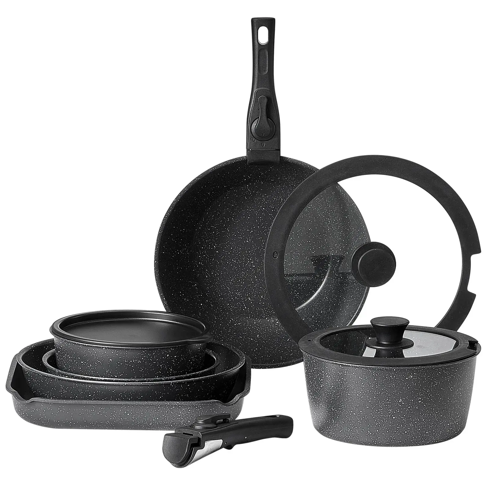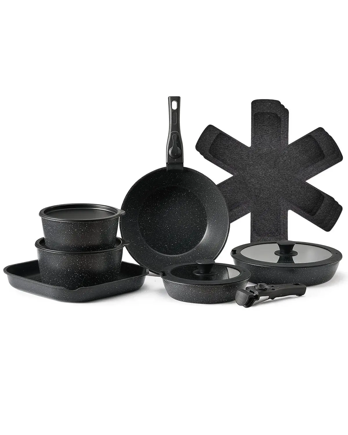 ·Easy to Store: The cookware set is designed with a detachable handle system, allowing easy replacement with just one press. Removing the handles saves up to 70% storage space, making it convenient for stacking and compact storage in cabinets or RVs