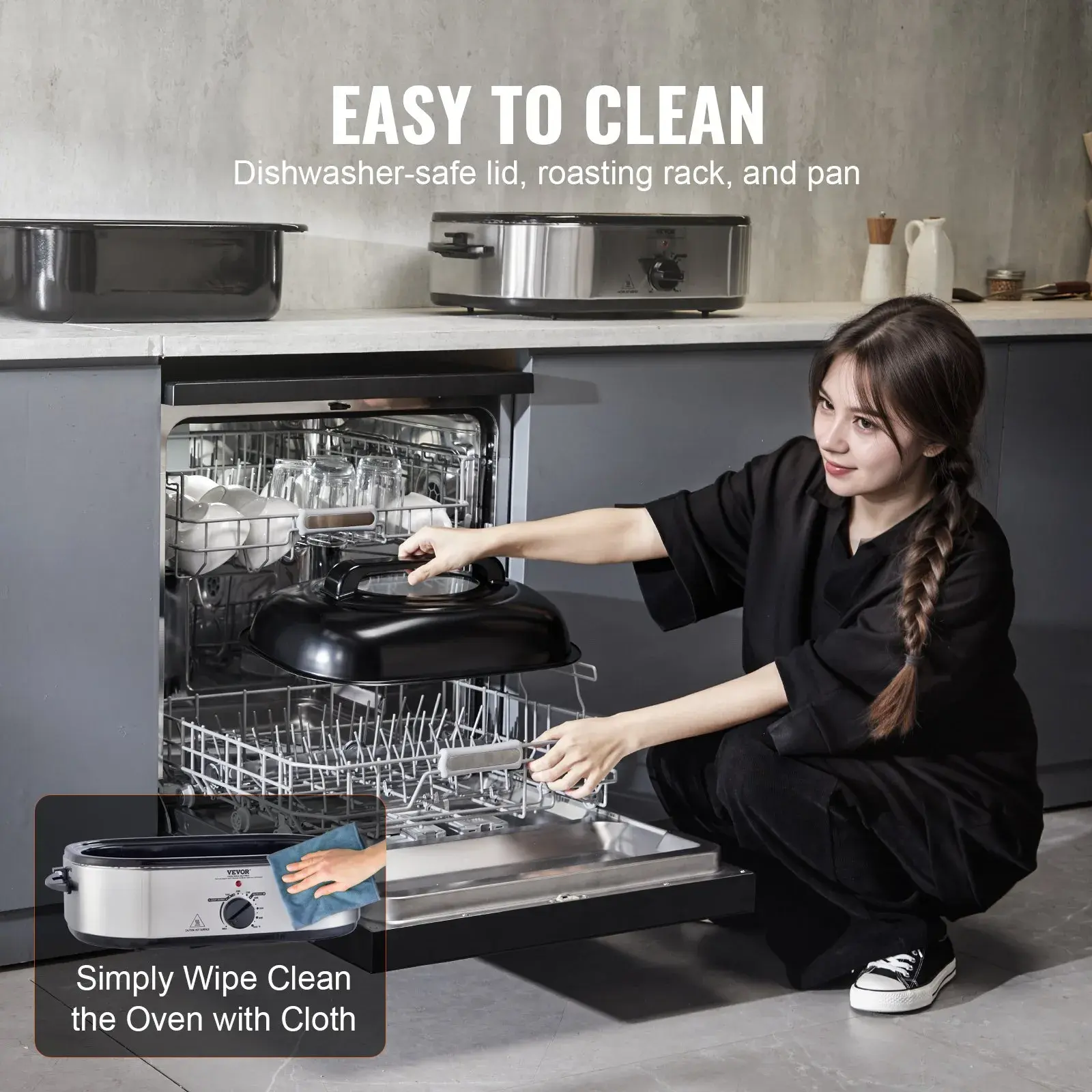 ·Keep Warm / Defrost / Roast: With 150℉ to 450℉ wide temperature, VEVOR roaster oven offers versatile cooking options for roasting, baking, and slow cooking. The defrost setting allows you to thaw frozen food quickly ; keep warm setting maintains the ideal serving temperature, letting you prepare meals ahead without concerns of them getting cold.