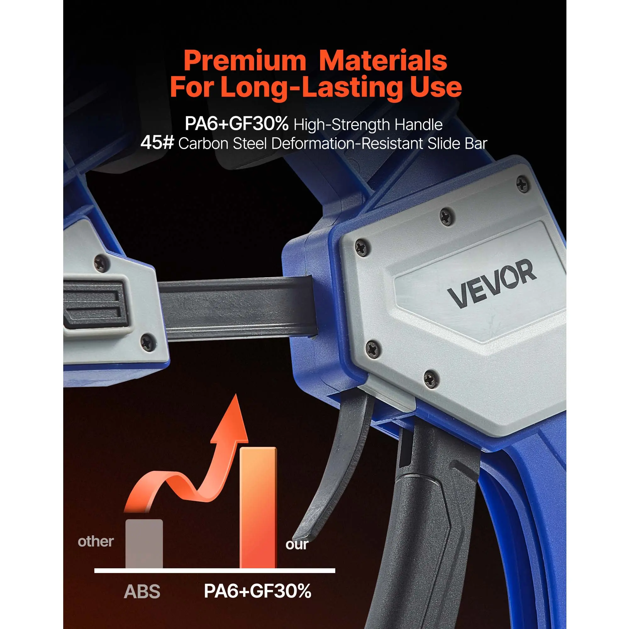 • High-quality Materials: The handle of our bar clamps is made of PA6+GF30% high-strength plastic, stronger and more durable than ABS. The slide bar is constructed from 45# carbon structural steel, ensuring long-lasting and crack-resistant performance