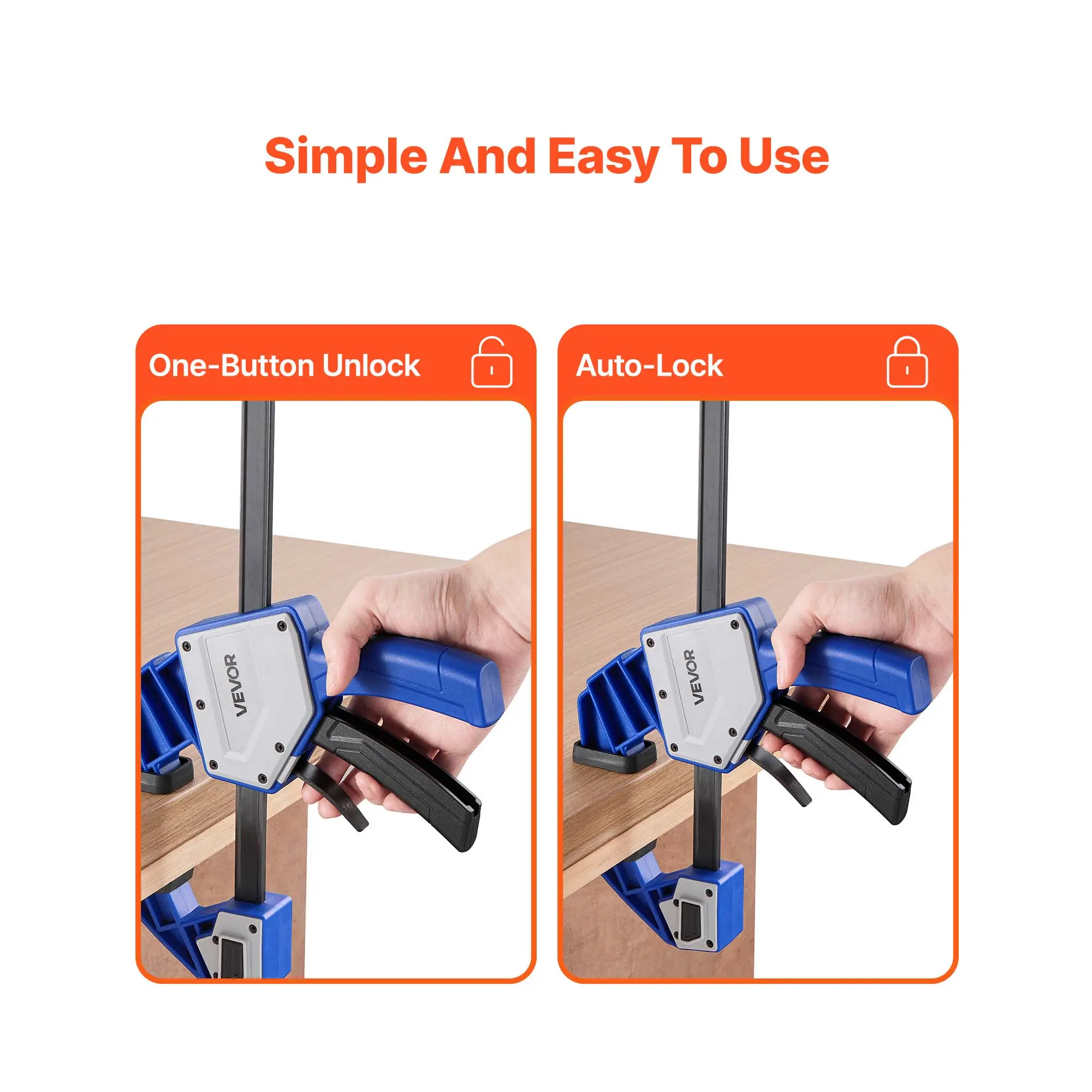 • Simple and Easy to Use: With automatic lock and one-button unlock, our F clamps allow for single-handed operation throughout the process, making the processing efficient and time-saving