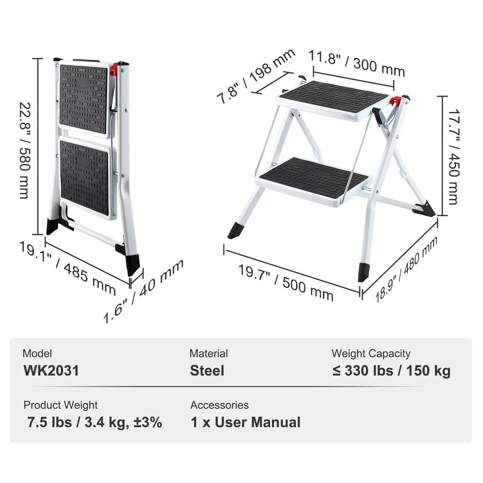 • Foldable Two-Step Step Stool: Our two-step step stool is designed for quick and easy folding. Equipped with a convenient lock, simply press the red lock to fold it down swiftly, making it easy to open for use and store when not in use. The dimensions of this two-step step stool when opened are 19.7" L x 18.9" W x 17.7" H, with a step height of 17.5" / 445 mm, perfect for everyday household needs.