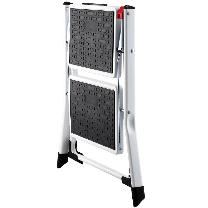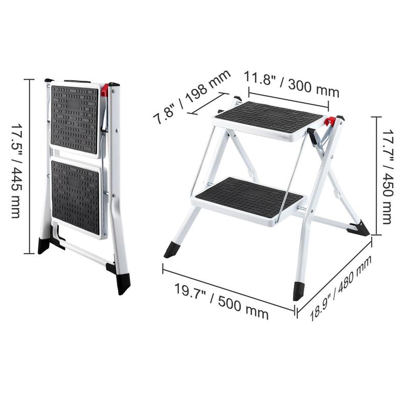 • Foldable Two-Step Step Stool: Our two-step step stool is designed for quick and easy folding. Equipped with a convenient lock, simply press the red lock to fold it down swiftly, making it easy to open for use and store when not in use. The dimensions of this two-step step stool when opened are 19.7" L x 18.9" W x 17.7" H, with a step height of 17.5" / 445 mm, perfect for everyday household needs.