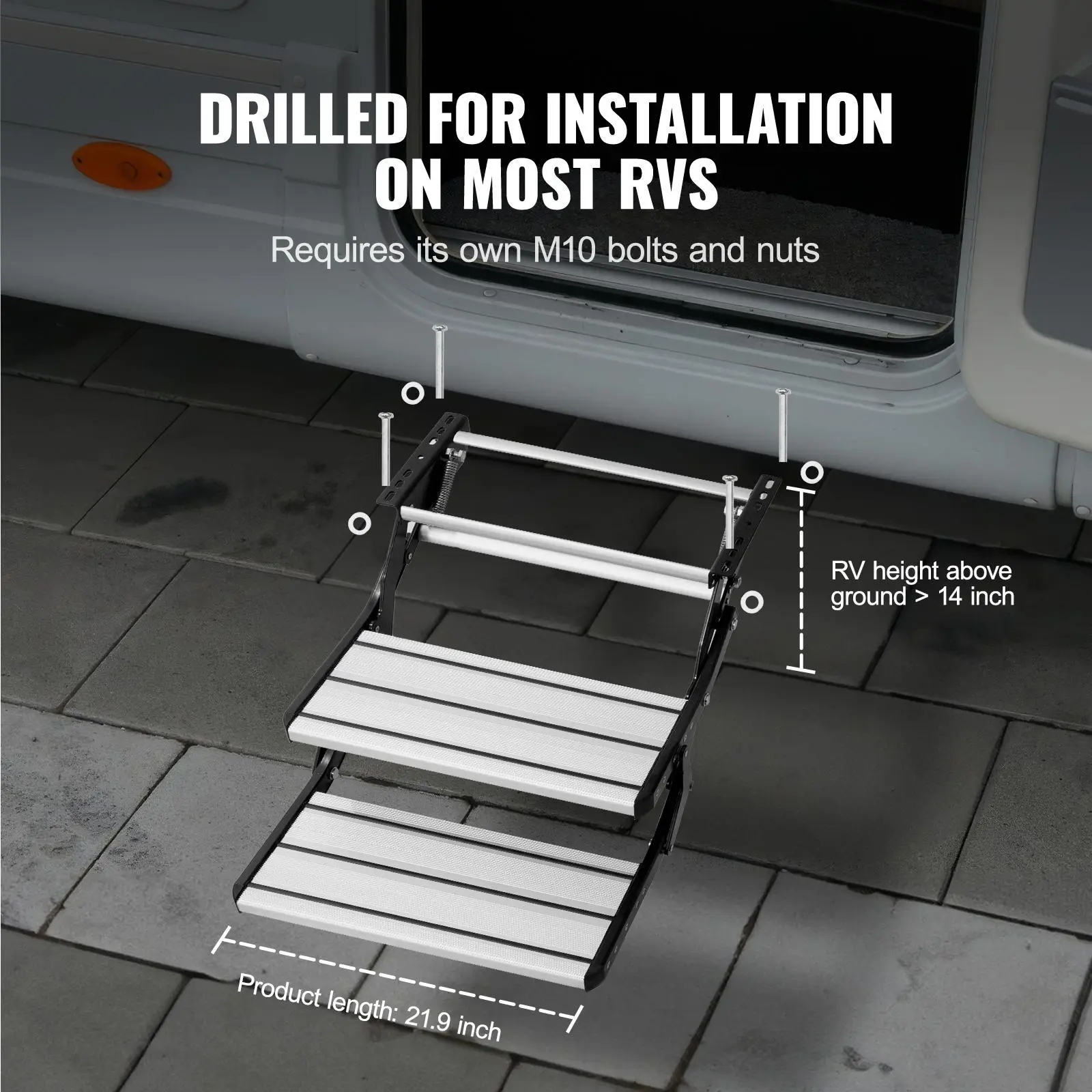 • Drill Installation: You can drill and mount it to your RV entrance door threshold, and fold it for storage when not in use without requiring extra space. Your RV ladder can travel with your RV anywhere. Note: M10 bolts and nuts are not included and professional installation is recommended for wiring.