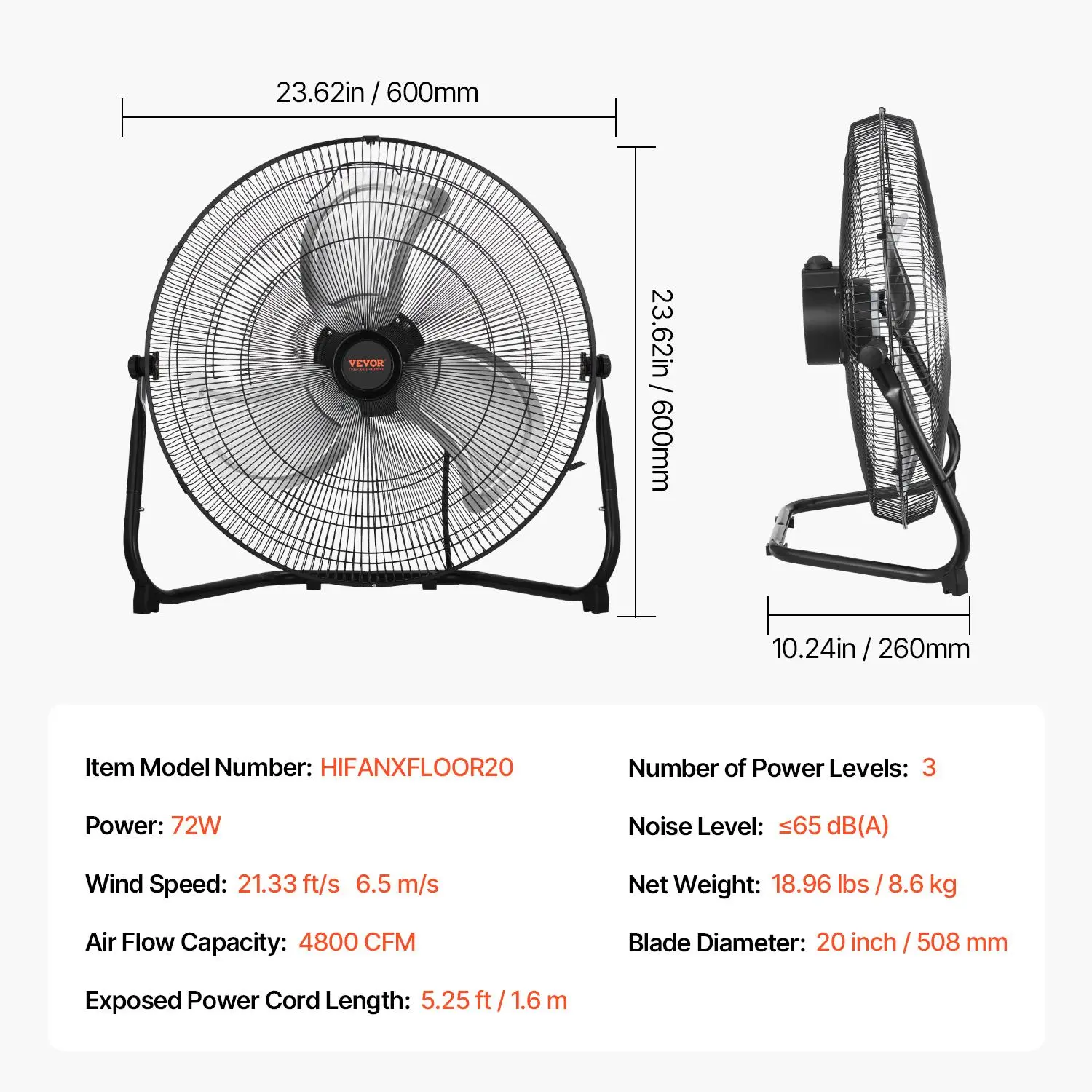 • High-Speed, Low Noise: Our high velocity floor fan features a 3-speed dual ball-bearing motor, delivering up to 4800 CFM airflow with an outstanding air throw of 22.97 ft and remarkable wind speed at 21.33 ft/s. Besides, the max noise is below 65 dB(A), ideal for rapid but not loud cooling.