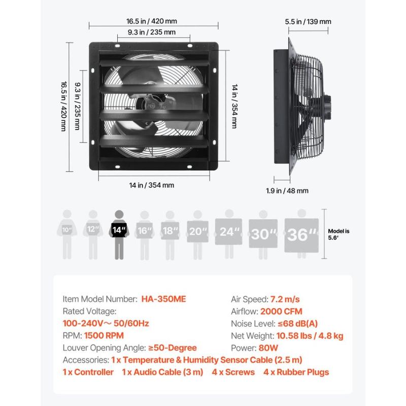VEVOR 20 inch Shutter Exhaust Fan, Wall Mounted Attic Vent Fan with Smart Programming Variable Speed Temperature Control, 4800 CFM, EC Motor, Timer, for Shed, Garage, Greenhouse Ventilation Cooling, BlackVEVOR 14 inch Shutter Exhaust Fan, Wall Mounted Attic Vent Fan with Smart Programming Variable Speed Temperature Control, 2000 CFM,EC Motor,Timer, for Shed,Garage,Greenhouse Ventilation Cooling,Black Electrostatic Coating Spiral Fan Blades Weather-Resistant Build Robust