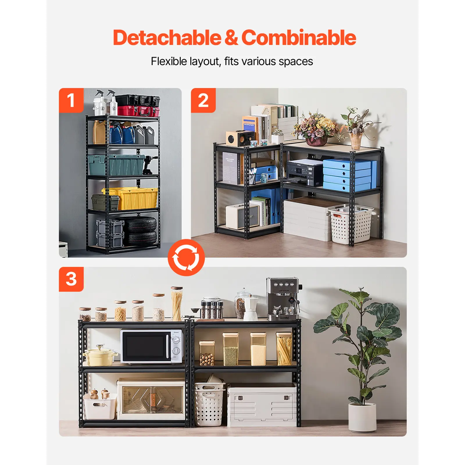 • Split Design: This garage shelving unit can be split into two separate racks for flexible use in spaces with height restrictions, such as under stairs, basements, or hallway corners.