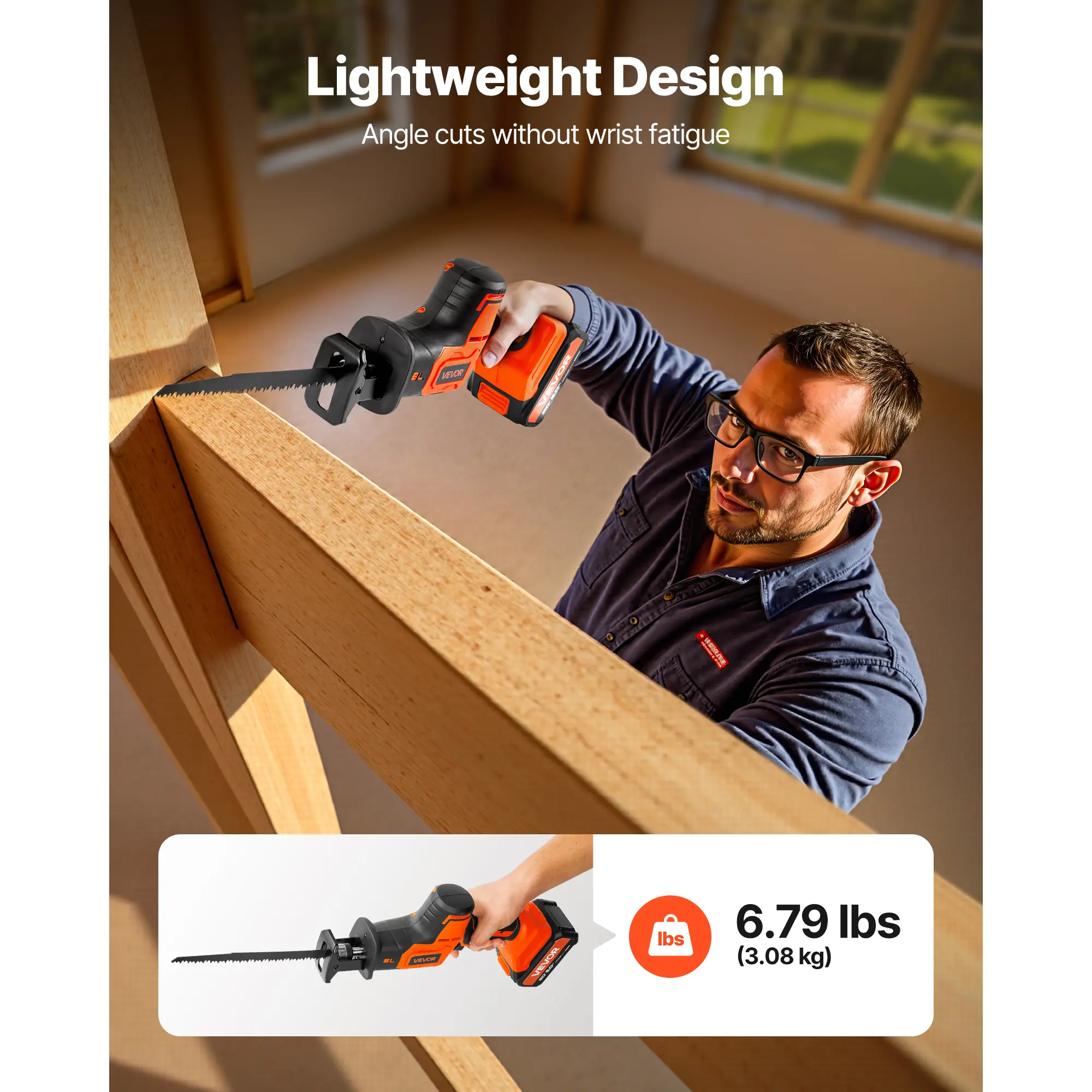 • Light and Portable: The electric reciprocating saw weighs just 6.79 lbs / 3.08 kg. The lightweight body reduces wrist strain during overhead or awkward-angle cuts, helping ease fatigue over long sessions