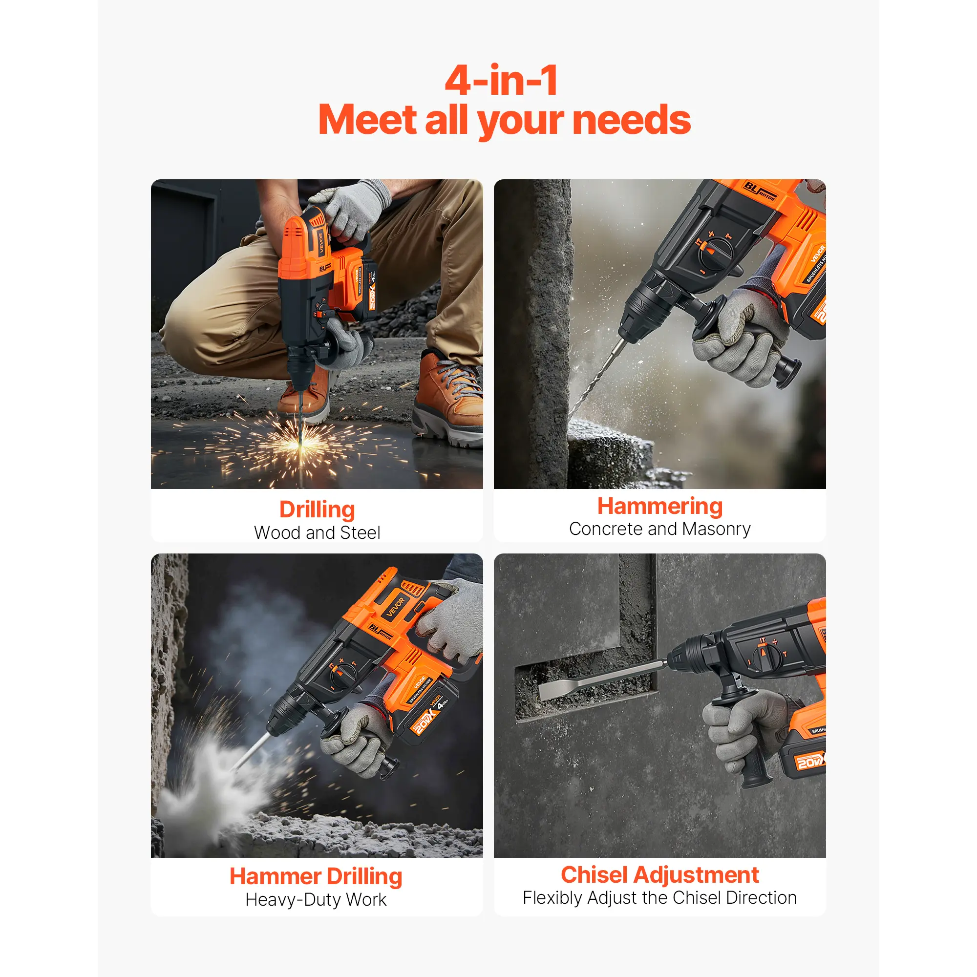 • 4-in-1 Functionality: Featuring four easily switchable modes—drill only (for wood and steel), hammer only (for concrete and brick), hammer drill (for heavy-duty tasks), and chisel adjustment—this cordless hammer drill adapts to your project needs. Dual switch buttons extend the tool's lifespan compared to single-switch designs, giving you a more reliable experience