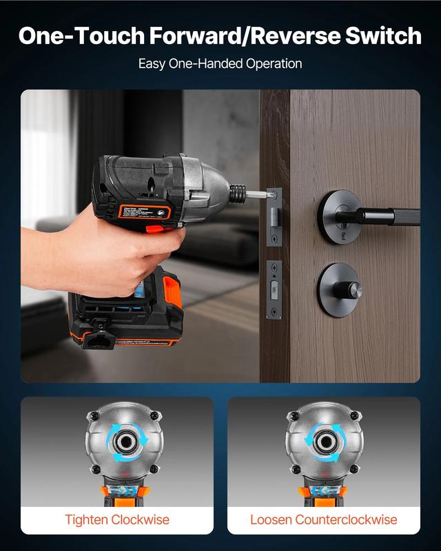 The VEVOR Impact Driver features a 1/4 inch, 2800 RPM max speed, and a 20 V brushless motor. It includes a battery and charger, with 20 bits for versatile use. Perfect for furniture, electrical, and home repairs.