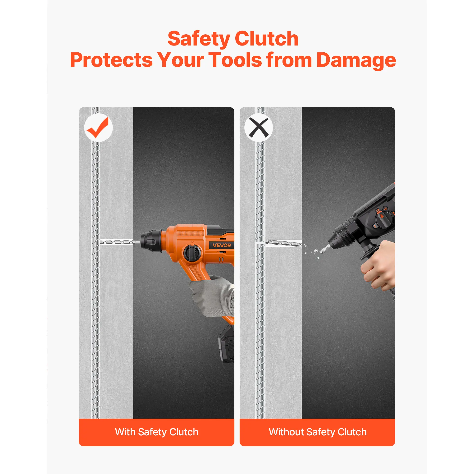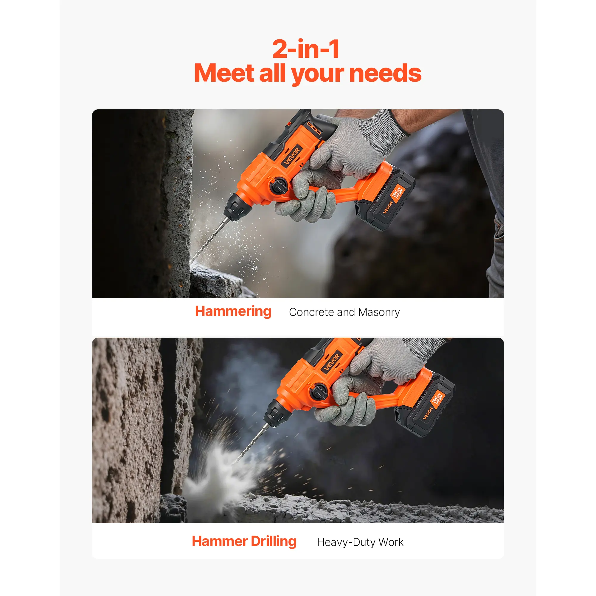 • Choose Between 2 Functions: Easily switch between two operating modes—hammer only (ideal for concrete and brick) and hammer drill (ideal for heavy-duty applications). The dual switch buttons provide longer service life than single-button systems, ensuring more reliable operation over time