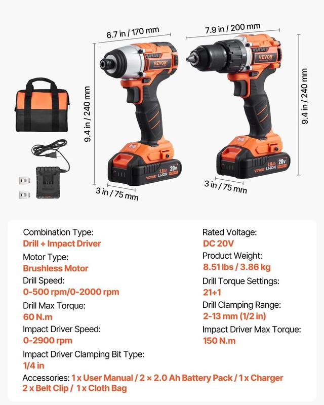 ·20V 2-Piece Tool Set: This tool combo kit includes a 1/2 in drill, a 1/4 in impact driver, and two 20V 2Ah batteries, designed specifically for professional users to meet high-intensity, high-efficiency work demands. It is ideal for professional repairs, home renovations/assembly, and construction sites, making it a great choice for both professionals and homeowners for various projects