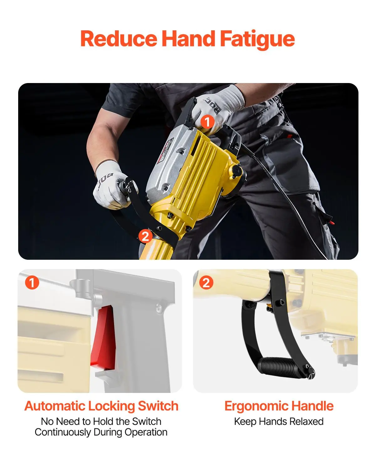 • Stays Cool During Intense Work: The efficient cooling system effectively cools the motor to improve the concrete breaker's life. The engine will be at low temperatures even after a long working time.