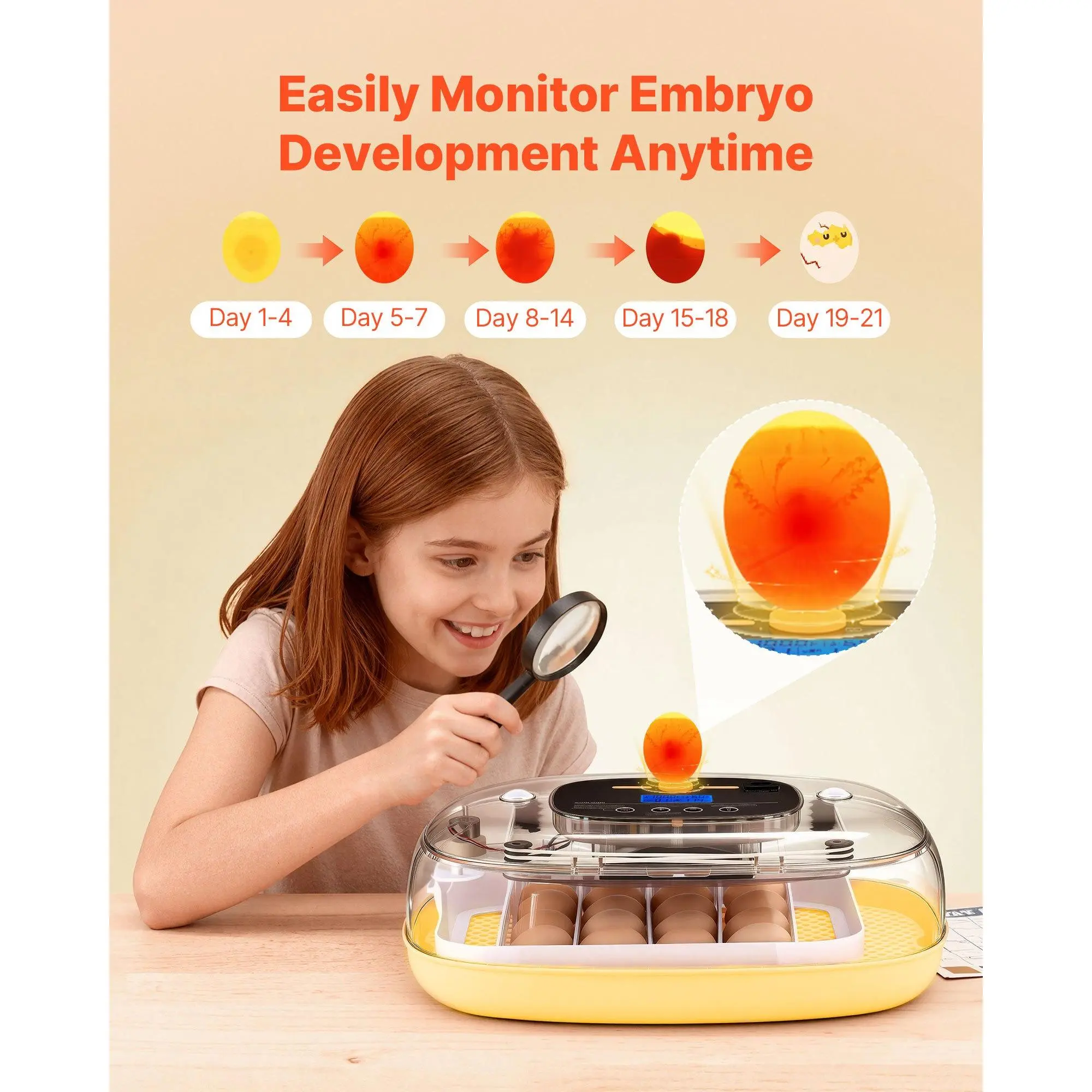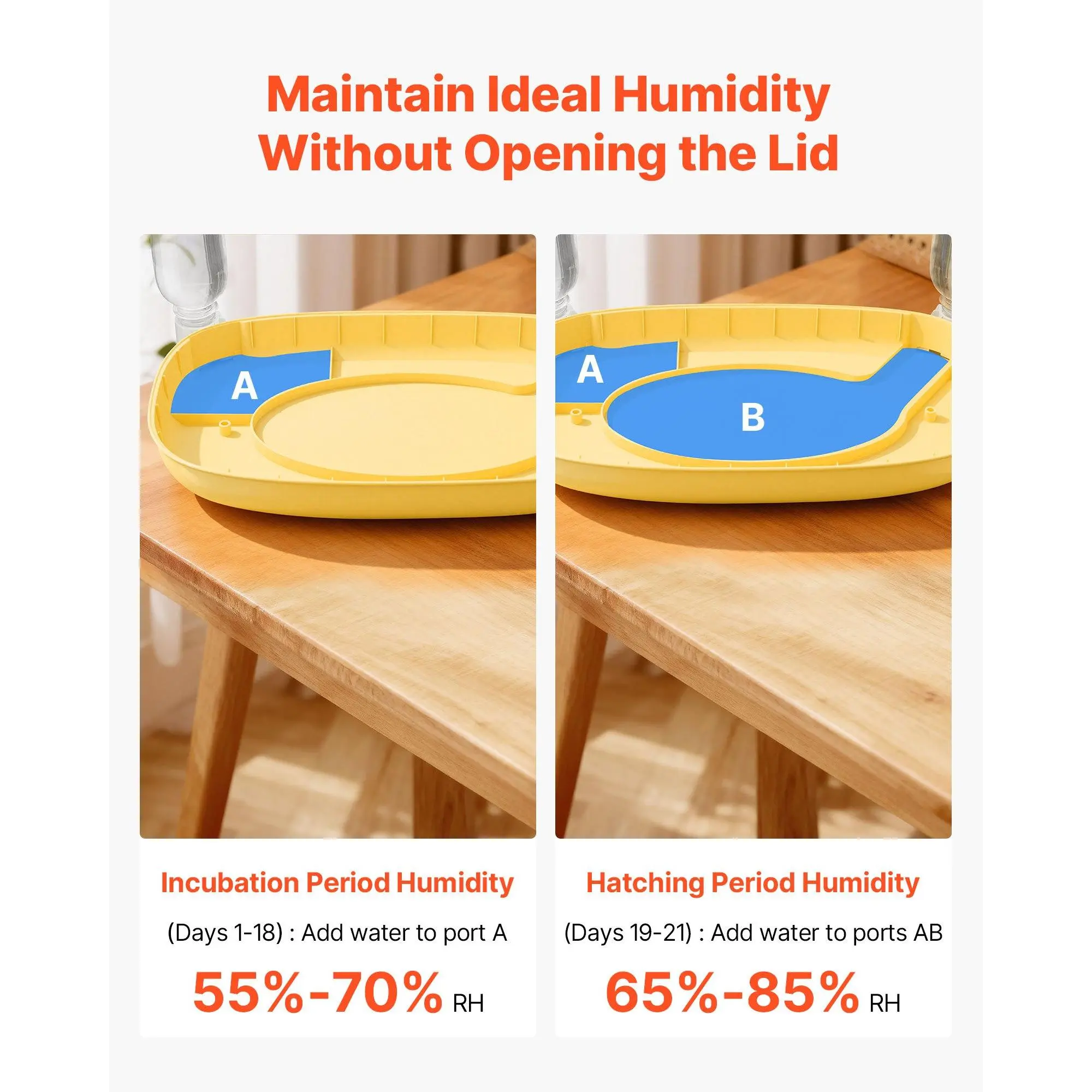 Digital Display & Precise Control: Our incubator for hatching eggs shows temp-humidity on a screen.With a 68-104°F range, dual-zone auto water refill, and 360° air circulation, it provides accurate condition control and distributes temp-humidityAutomatic Water Refill: The egg incubator includes an AB dual-zone auto refill system, allowing you to add water without opening the lid.One bottle lasts 8–10 days, minimizing manual refills and easily maintaining ideal humidity180° Automatic Egg Turning (One Turn): Designed to mimic a mother hen’s gentle care, this egg hatching incubator gently turns eggs automatically with six selectable intervals, each lasting 10 seconds.It avoids embryo adhesion while ensuring even heatingEgg Candler & 360° Viewing Window: Our automatic egg turner comes with a 10W Lux high-brightness egg candler for easy embryo inspection.The 360° transparent viewing window lets the whole family witness the process of the chicks' birthAdjustable Egg Spacing: Fitting various egg types, our duck egg incubator can hold up to 24 chicken eggs, 15 duck eggs, 3 goose eggs, or 54 smaller eggs, such as quail eggsVEVOR 24 Egg Incubator, Automatic Egg Turner with LED Candler, Temperature & Humidity Control, 360 ° View Clear Window, Auto Water Refill, Poultry Eggs Incubators for Hatching Chicks Ducks Goose Quail